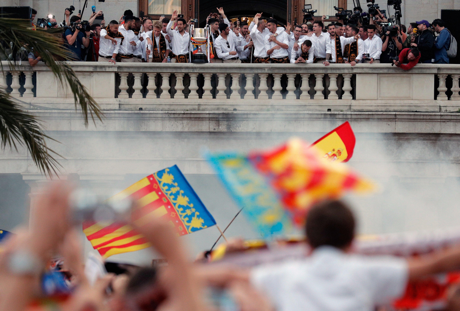 Jaume Doménech i el tècnic, Marcelino García Toral, que ha volgut recordar als jugadors que menys han participat, han parlat també en el balcó, on novament el defensa brasiler, Gabriel Paulista, ha tornat a liderar les celebracions, amb càntics i balls que han pogut compartir amb una afició entregada.