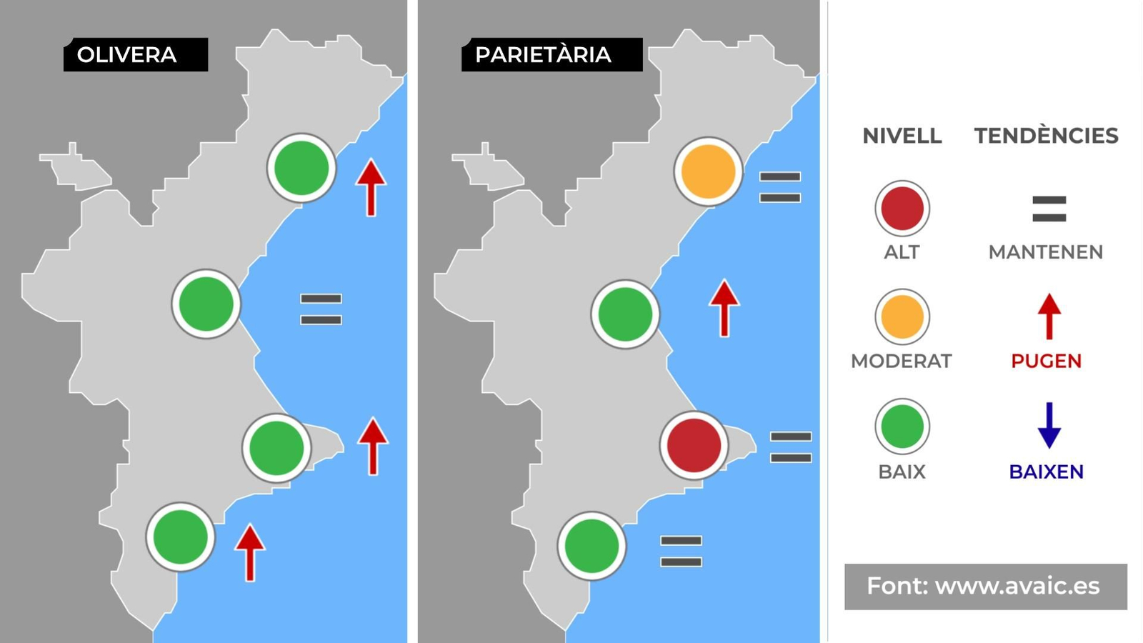 Les parietàries també n'han baixat les concentracions, encara que el nivell s'ha mantingut alt en zones com ara Xàtiva i Pego. Els pròxims dies s'esperen nivells moderats i alts, excepte a Alacant, on es mantindran baixos.