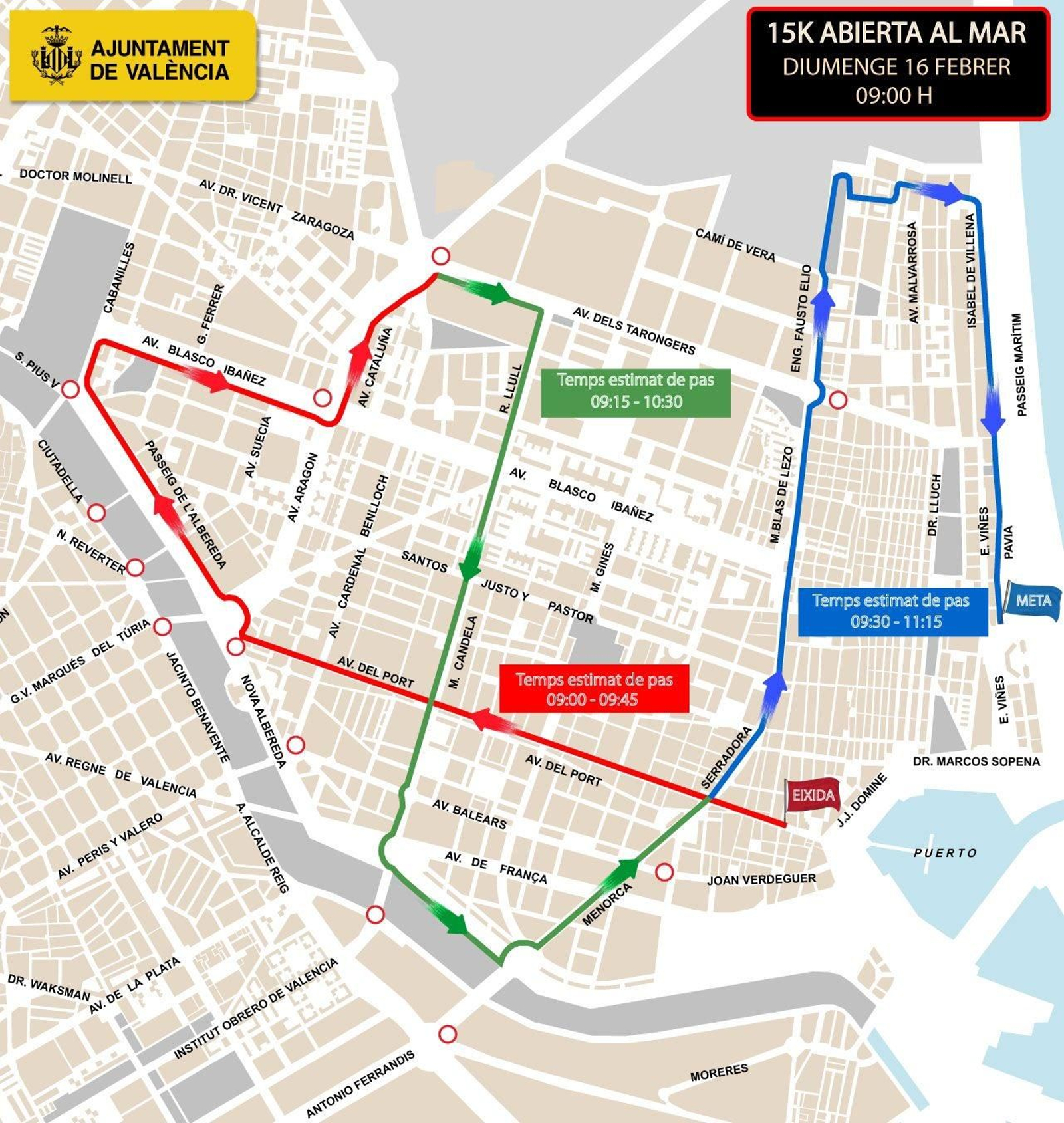 Alhora, la capital del Túria celebra una nova edició de la 15K que recorrerà la façana marítima de la ciutat. Hi participaran vora 10.000 corredors i corredores i també influirà en el trànsit de la ciutat a partir de les 9:00 h. La Regidoria de Mobilitat ha informat dels talls als carrers en tres franges horàries diferents. Entre les 9:00 h i les 9:45 h, la carrera afectarà les vies de l'avinguda del Port, el passeig de l'Albereda, l'avinguda de Blasco Ibáñez i la de Catalunya. Des de les 9:15 h fins a les 10:30 h, el pas estimat de la 15K afectarà l'avinguda dels Tarongers, Ramon Llull, Manuel Candela i Menorca. Finalment, des de les 9:30 h fins a les 11:15 h, el trànsit quedarà interromput al carrer de la Serradora, del Marí Blas de Lezo, de l’Enginyer Fausto Elio, d'Isabel de Villena i de Pavia, on se situa la meta final.
