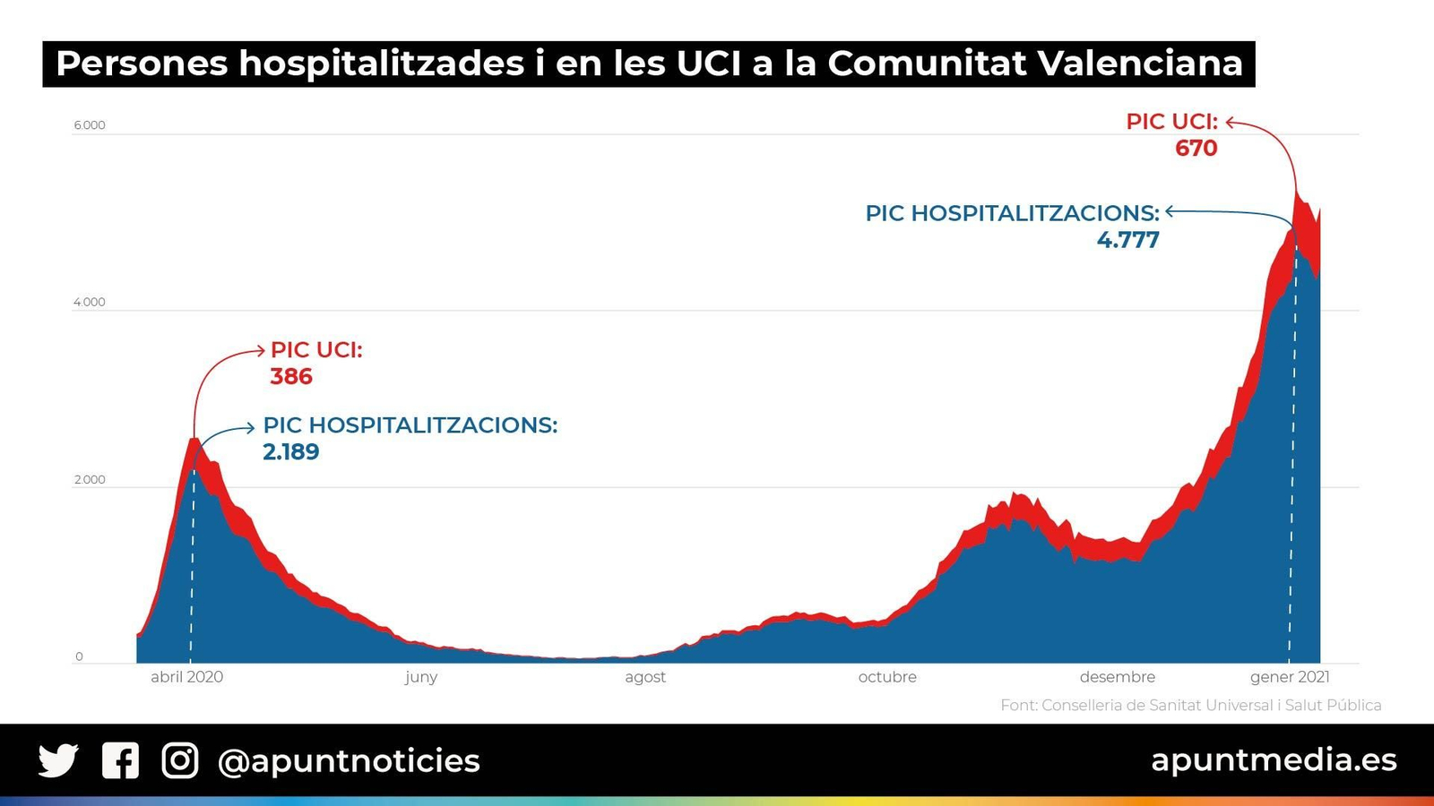 L'explosió de contagis de gener també ha tingut impacte en els hospitals valencians, on la Generalitat ja reconeix una situació de saturació que és pitjor que en la primera onada. El volum d'ingressos per Covid-19 en planta i unitats de cures intensives (UCI) ja estava en escalada al desembre i no ha parat de créixer en el mes de gener, fins al punt que s'han superat molt folgadament els pics registrats a l’abril. Segons l'última actualització de Sanitat hi ha a hores d'ara 4.484 persones hospitalitzades amb la malaltia, de les quals 670 estan en crítics. La xifra d'ingressos en planta ha minvat lleugerament durant la darrera setmana després d'arribar al màxim el passat 25 de gener (4.777), però l'ocupació actual de pacients UCI és rècord absolut de tota la pandèmia amb una xifra 300 punts per damunt del pic assolit a l’abril (386).