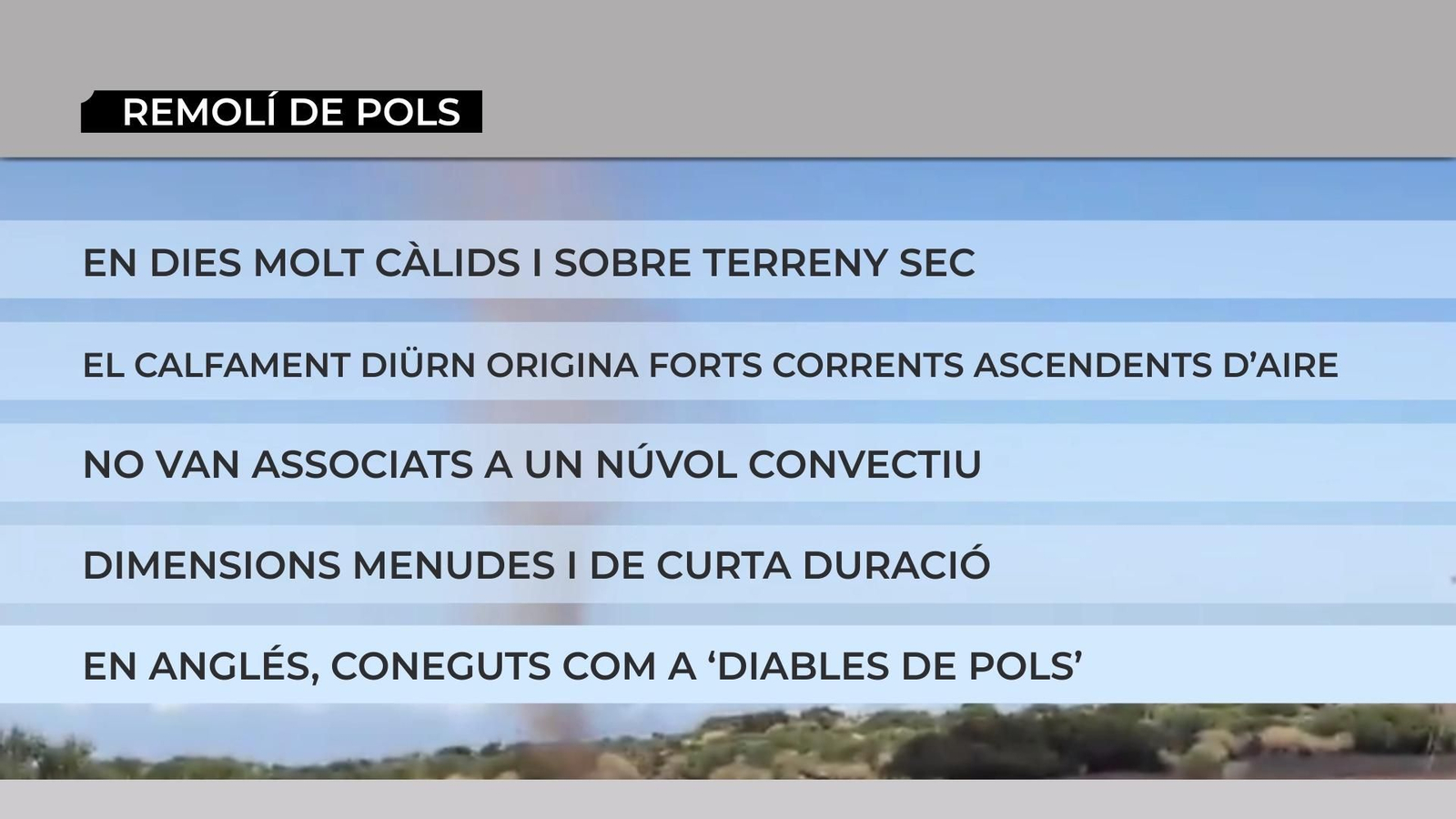 Ja veieu com del no-res sorgeix un remolí que no està associat a cap núvol convectiu. Són fruit del fort calfament diürn i es donen sobre terrenys molt secs. De fet, són visibles per la pols o d'altres objectes que alça. En el següent gràfic recollim algunes de les seues característiques.