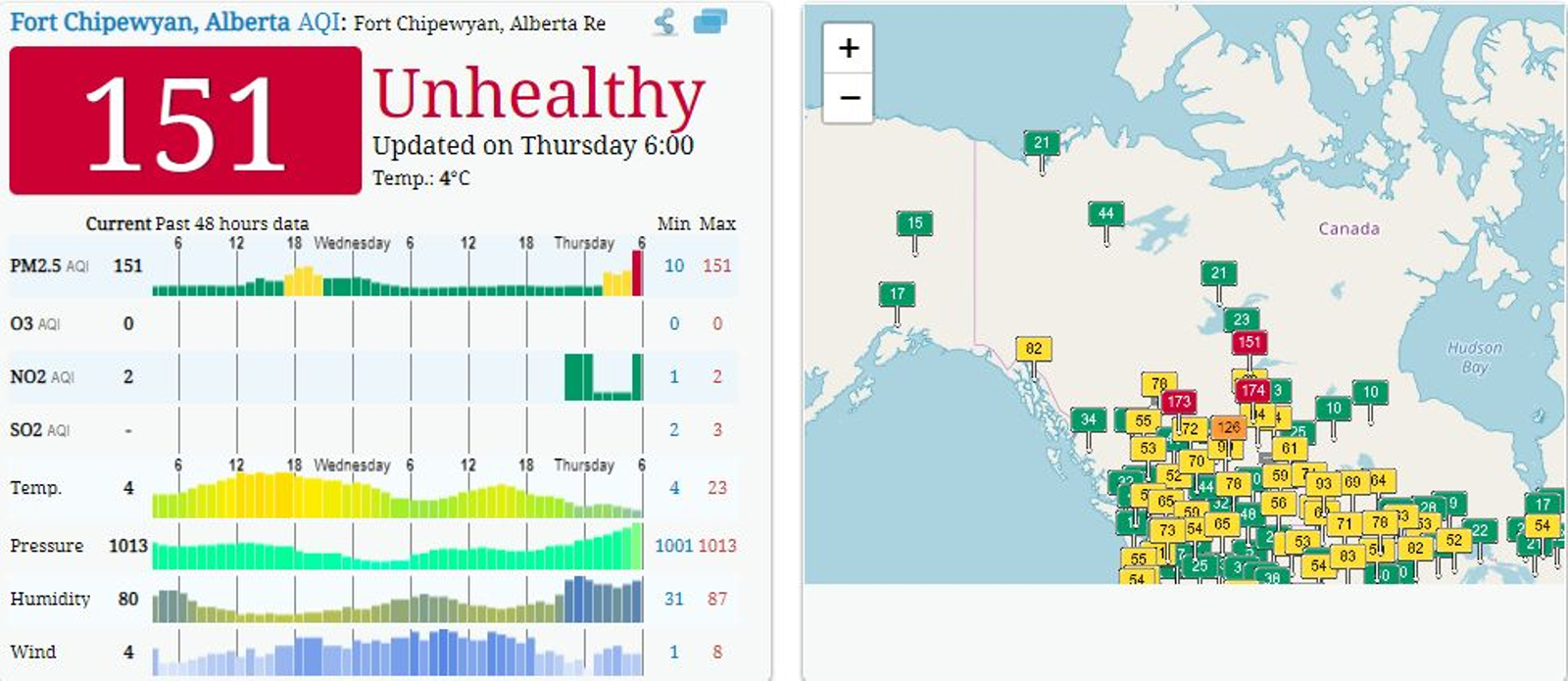 De fet, podem comprovar en la imatge anterior que el dia 30 de maig la qualitat de l'aire d'alguns observatoris d'Alberta va estar considerada insalubre. Sense dubte, un tema per a reflexionar.