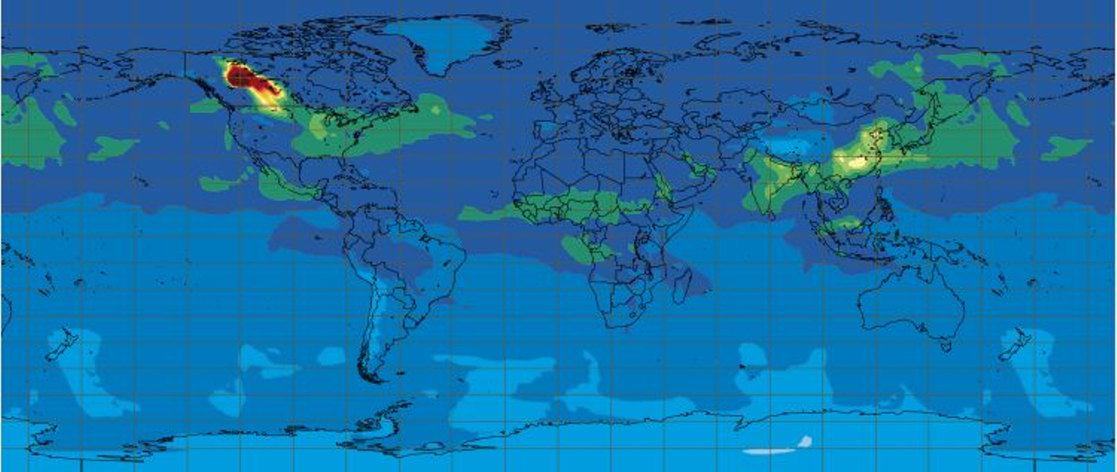 Analitzem un segon mapa, el de la densitat de monòxid de carboni, un contaminant a l'atmosfera produït per la crema de combustibles fòssils, a més dels incendis forestals i la crema de biomassa. Veiem com en aquest cas, la densitat és més homogènia al llarg del planeta, tot i que veiem pics importants a l'Índia i la Xina. Però sense dubte, el més important el trobem novament al nord del Canadà. Aquest índex ja dona pistes que efectivament els combustibles fòssils estan pel mig. Però quin?