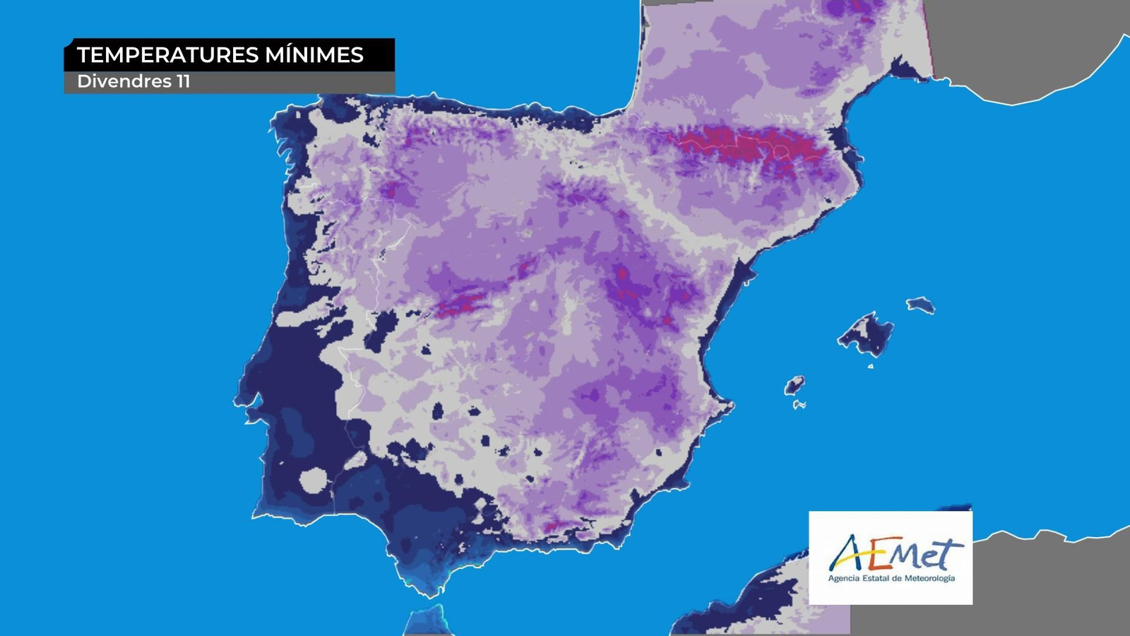Les temperatures nocturnes més baixes s'han registrat la matinada de divendres i la matinada de dissabte. Les gelades són generalitzades a les comarques de l'interior i, fins i tot, podran haver-n'hi prop de la costa de València i de Castelló.
