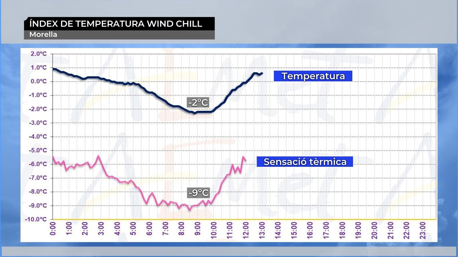 La massa d'aire fred ha arribat aquest dijous a la Comunitat Valenciana i ha provocat que les temperatures màximes de dijous baixaren entre 5 i 10 graus respecte dels valors de dimecres. Els termòmetres han caigut aquesta nit fins als 11 graus negatius de Vistabella del Maestrat i els 9 d'Ademús. De fet, les temperatures durant la matinada del divendres han sigut les més baixes registrades en dos anys al territori valencià, segons ha informat l'Agència Estatal de Meteorologia (Aemet). Per això, l’entitat ha decretat alerta groga per a aquesta nit a les comarques del centre i del sud de la Comunitat Valenciana per temperatures mínimes que poden arribar als 4 graus per davall de zero