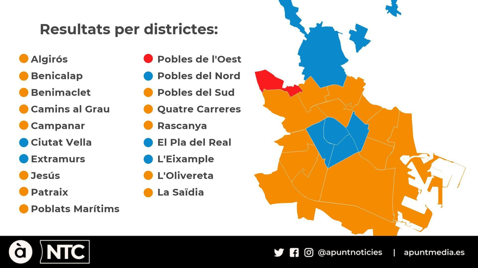 La victòria de Compromís es reprodueix en 13 dels 19 districtes de la ciutat, però el PSPV-PSOE aconsegueix imposar-se com a primera força als Pobles de l'Oest. El PP, per contra, manté els feus tradicionals: Ciutat Vella, Eixample, Extramurs i el Pla del Real. Compromís baixa a la segona posició en tres d'aquests quatre districtes, però queda desplaçat al tercer lloc en el Pla del Real, ja que Ciutadans s'hi consolida com a segona força. El PP també aconsegueix imposar-se als Pobles del Nord.