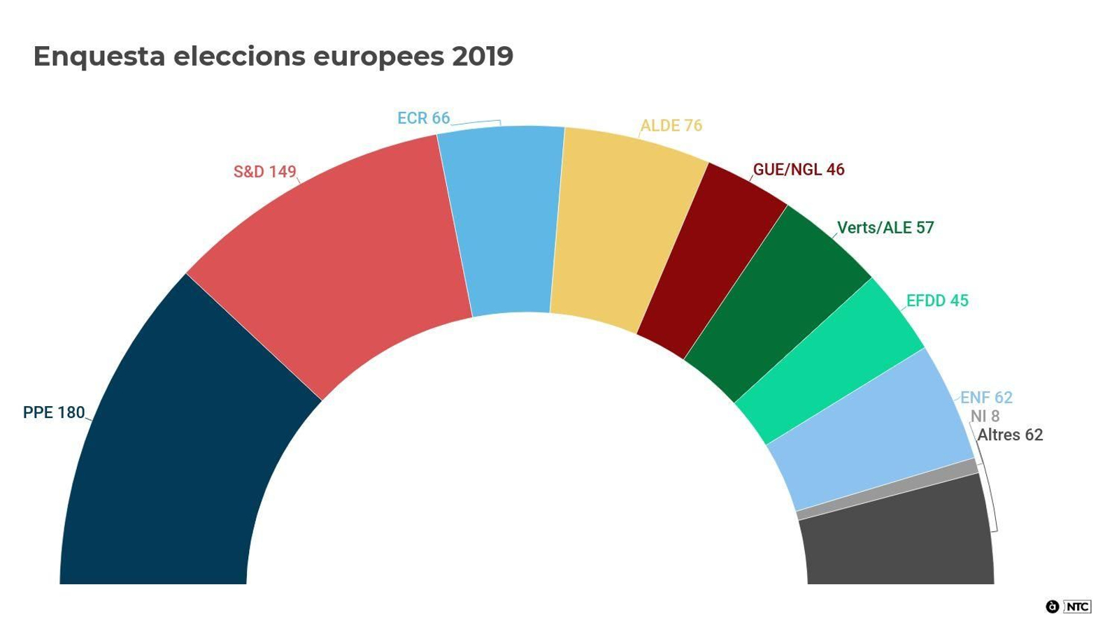 El Parlament Europeu ha publicat els resultats d'una enquesta basada en la intenció de vot. El Partit Popular Europeu tornaria a guanyar les eleccions, però perdria 37 escons i n'aconseguiria 180. Per la seua banda, el Partit Socialista també perdria representació i obtindria 149 eurodiputats. Segons les dades publicades, els únics partits que guanyarien escons respecte de les eleccions del 2014 serien el Grup Europa de les Nacions i de les Llibertats, que passaria de 36 a 62; l'Aliança dels Demòcrates i Liberals per Europa, que passaria de 68 a 76 i el Grup dels Verds / Aliança Lliure Europea, que guanyaria 6 escons fins a arribar a 51.