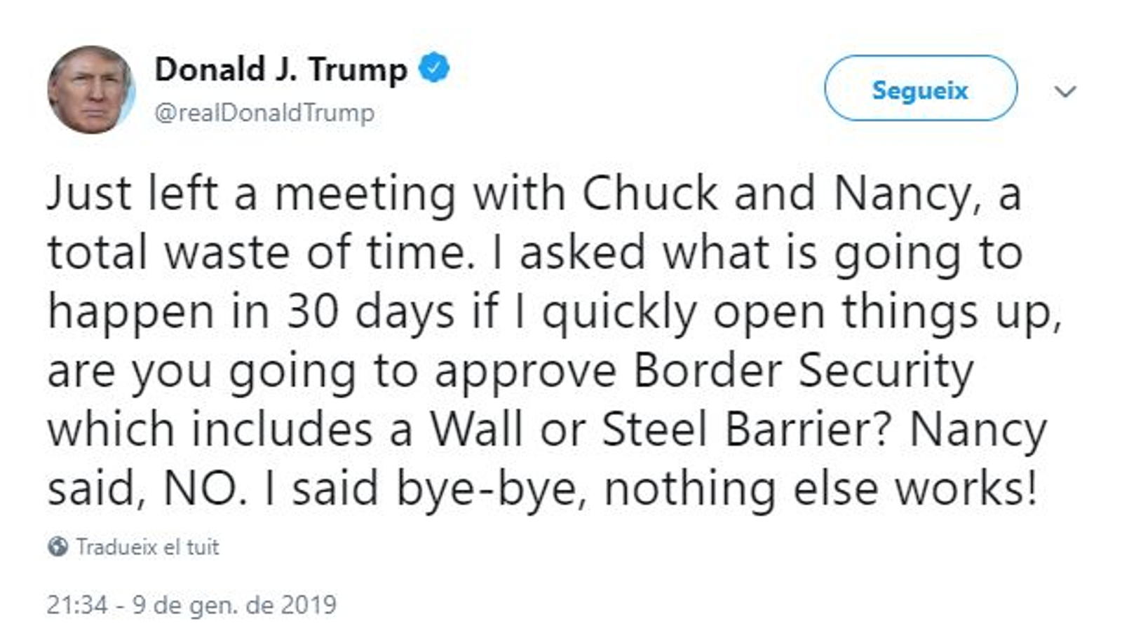 El mateix Trump ha qualificat de “pèrdua de temps” la reunió en el seu compte de Twitter. “Nancy ha dit, NO. I jo li he dit “bye-bye” ha escrit en la xarxa social.