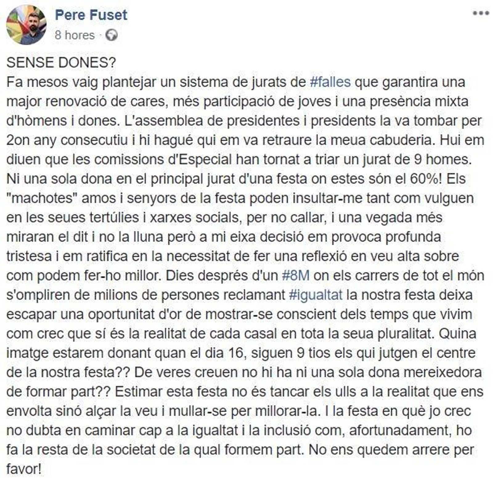 Fuset ha criticat l’elecció del jurat a través de les xarxes socials. “Els machotes amos i senyors de la festa poden insultar-me tot el que vulguen en les seues tertúlies i xarxes socials, però a mi aquesta decisió em provoca una profunda tristesa i em ratifica en la necessitat de fer una reflexió en veu alta sobre com podem fer-ho millor”, ha asseverat en el seu compte de Facebook.
