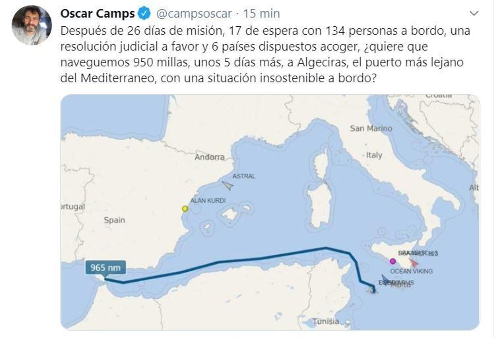 L’Open Arms, fondejat davant les costes de Lampedusa amb 107 migrants a bord, ha rebutjat l’oferta del govern espanyol per a dirigir-se al port d’Algesires. Creuen que està massa lluny, i la situació a bord ja és “insostenible”. Així s’ha manifestat el fundador de l’ONG, Òscar Camps, en Twitter. “Després de 26 dies de missió, 17 d’espera amb 134 persones a bord, una resolució judicial a favor i 6 països disposats acollir, vol que naveguem 950 milles, uns 5 dies més, a Algesires, el port més llunyà del Mediterrani, amb una situació insostenible a bord?”.