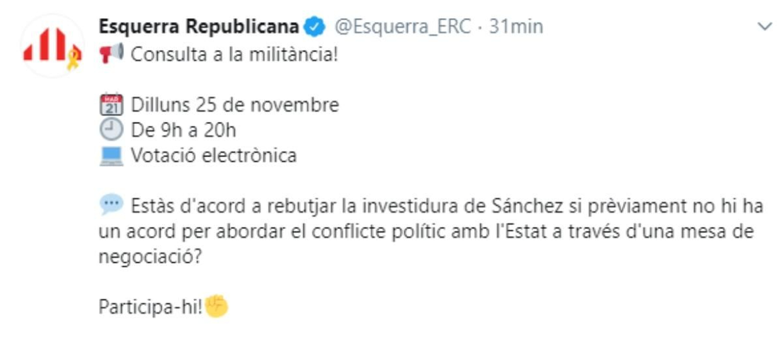 Esquerra Republicana efectuarà el dilluns 25 de novembre una consulta interna perquè la militància decidisca la posició del partit en la investidura del president del govern espanyol en funcions, Pedro Sánchez. L'abstenció dels republicans és clau perquè Sánchez resulte investit.