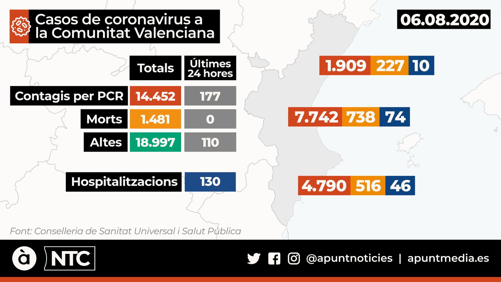 La Comunitat Valenciana acumula 177 nous casos de coronavirus i 18 nous brots en les últimes 24 hores, la majoria d’aquests, fins a set, vinculats a reunions socials. A hores d’ara se supera el centenar de brots des que es va alçar l’estat d’alarma. València, amb deu dels nous focus comunicats aquest dijous, i l'àrea metropolitana, amb quatre més, tornen a concentrar per segon dia gran part dels brots. D’altra banda, al nou balanç no s’inclou cap defunció més.
