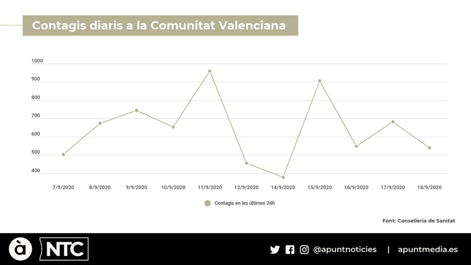 La xifra de nous contagis per coronavirus a la Comunitat Valenciana s’estabilitza. Després que dimarts passat es registraren 905 positius, la segona xifra més alta des de l’inici de la pandèmia, en els últims tres dies la xifra es manté al voltant de les 600 infeccions diàries. De fet, aquest divendres la Conselleria de Sanitat Universal ha notificat 540 contagis en les últimes 24 hores. Aquesta tendència es manté en les dos últimes setmanes, amb una mitjana de 639 casos.