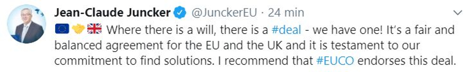 La Unió Europea i el Regne Unit han firmat un acord "just" i "equilibrat" per al Brexit, segons ha anunciat a través del seu compte de Twitter el president de la Comissió Europea, Jean-Claude Juncker. En una carta adjunta al missatge, informa d'una solució pactada per a Irlanda del Nord, l'entrebanc més gran de les negociacions, i recomana el Consell d'Europa acceptar-la.
