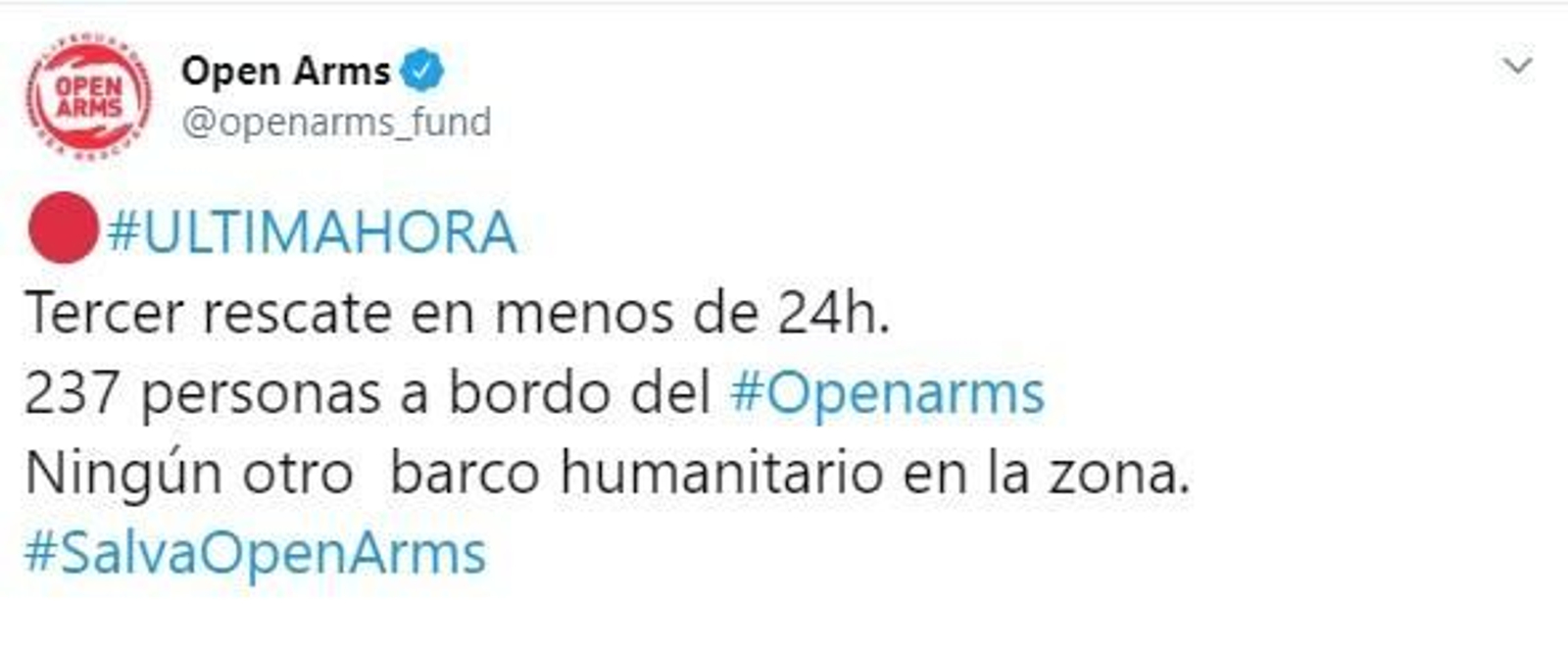 El rescat dut a terme per l’Open Arms s’ha produït a aigües de la zona de recerca i rescat de Líbia i Malta. Des de l’associació alerten que no hi ha cap vaixell humanitari prop de la zona on es troben.