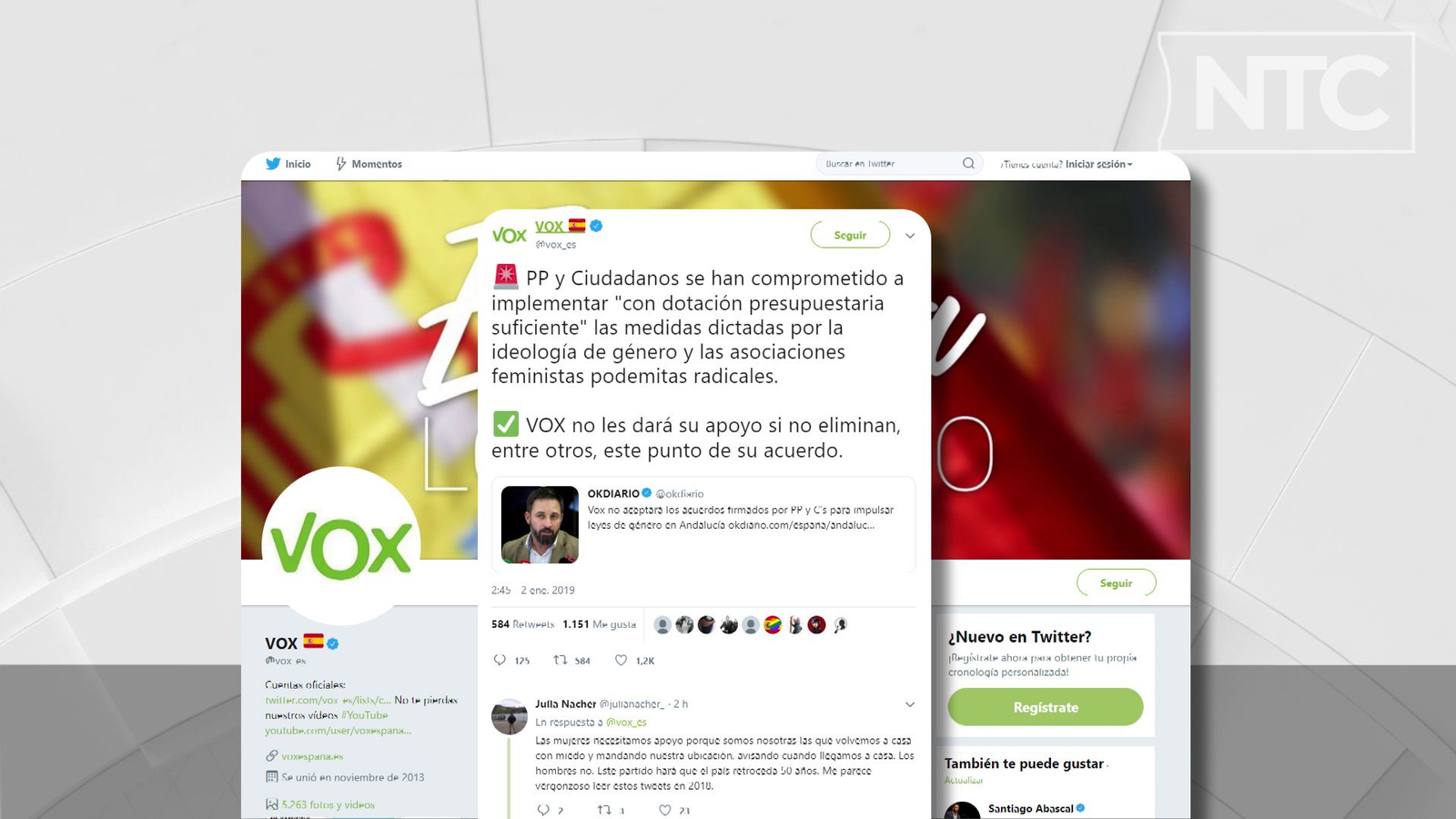 Vox ha anunciat a través del seu compte de Twitter que no donarà suport a un hipotètic govern de PP i Ciutadans a Andalusia si no eliminen el punt de l'acord programàtic en què es comprometen a implementar "amb dotació pressupostària suficient" totes les mesures incloses en la llei de prevenció i protecció integral contra la violència de gènere.
