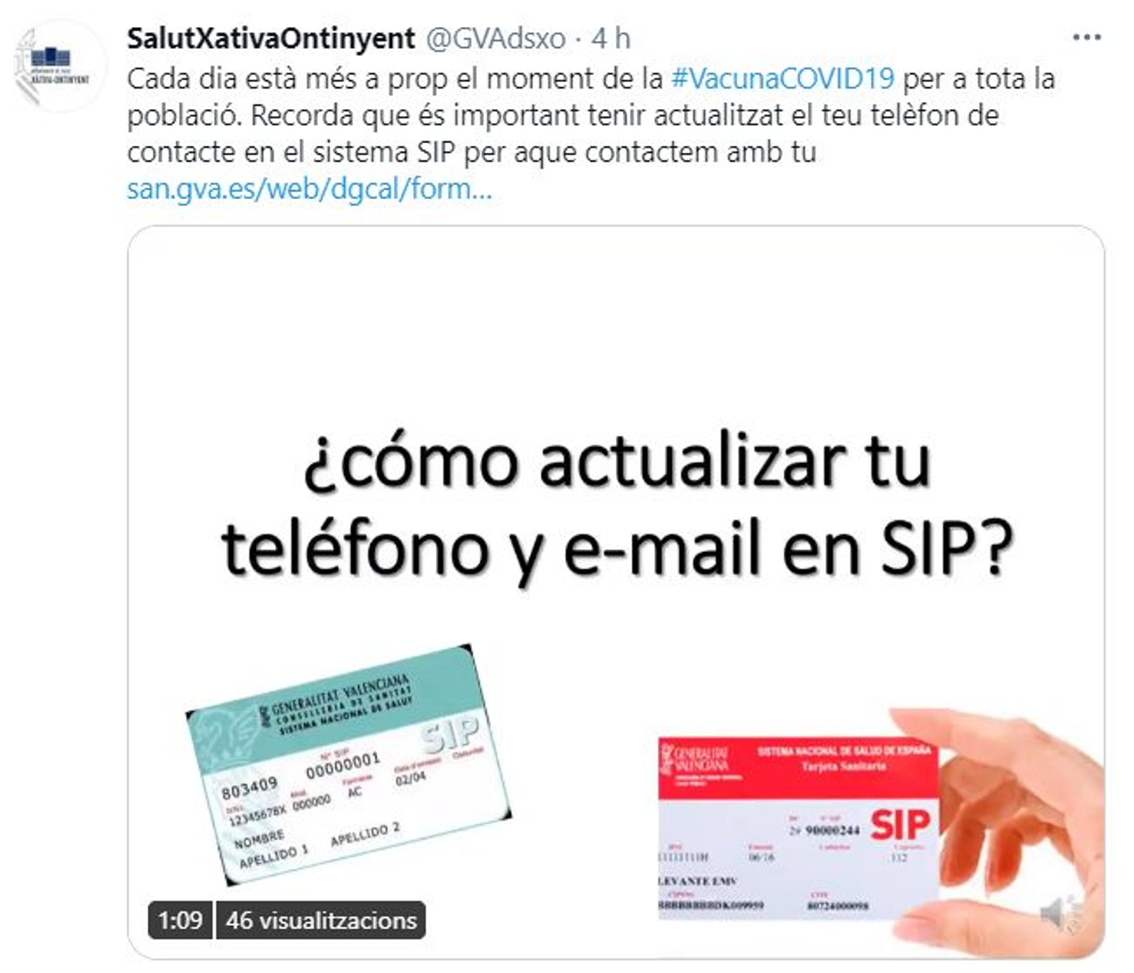 Amb la mirada posada en la vacunació massiva contra la Covid-19, que la Generalitat estudia posar en marxa aproximadament a l'abril en quatre punts del territori, cobra especial importància que tota la ciutadania tinga les dades de contacte actualitzades. A mitjan 2020 la Conselleria de Sanitat Universal va llançar una recomanació en aquest sentit, ja que els equips de vacunació contactaran majoritàriament els pacients a través del telèfon per a donar-los cita amb el dia, l'hora i el lloc que els pertoque. Un consell que ara, a mesura que s'acosta la data prevista perquè comence la immunització general de la població, molts departaments de salut, com ara el de Xàtiva-Ontinyent o el de l'Hospital General de València, estan recordant a través de les xarxes socials.