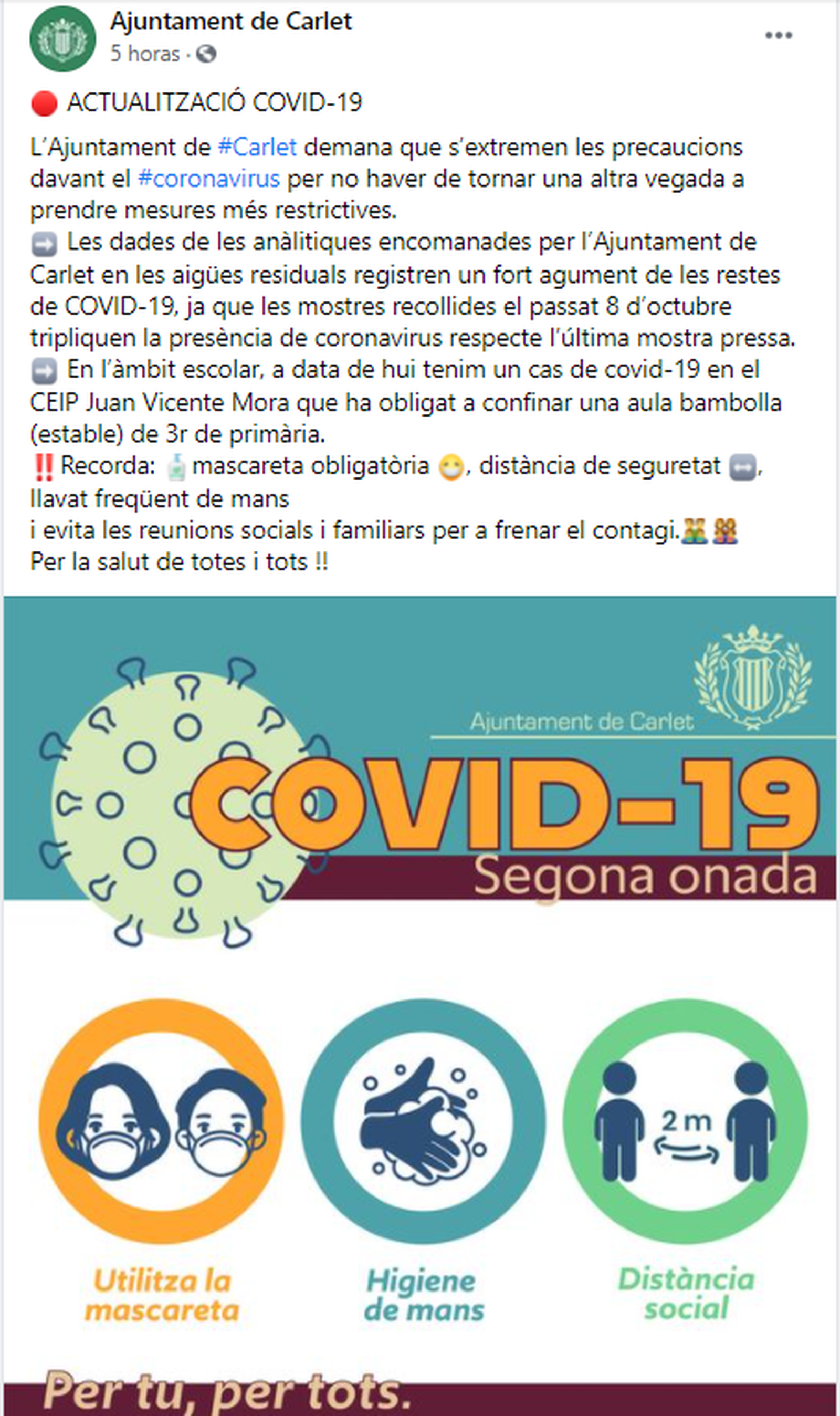 Publicació en el perfil de Facebook de l'Ajuntament de Carlet