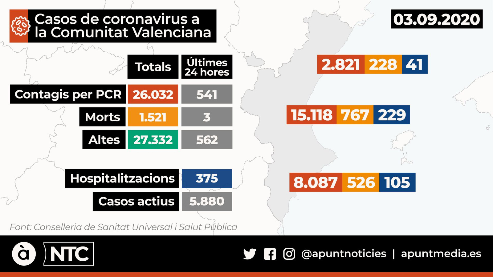 La Conselleria de Sanitat ha notificat aquest dijous 541 nous casos i tres morts per coronavirus a la Comunitat Valenciana. A més, ha informat de 28 nous brots, 15 dels quals s'han originat a la ciutat de València.