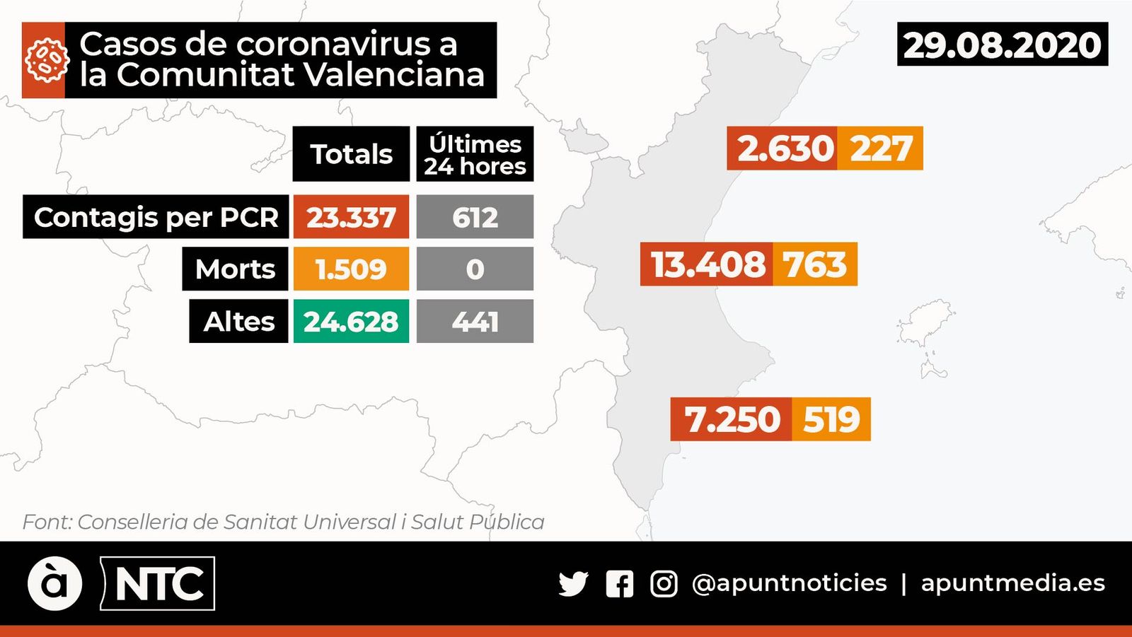 La Comunitat Valenciana va registrar 612 nous casos de coronavirus, segons ha informat aquest matí la Conselleria de Sanitat. El Consell ha informat que cap persona ha mort a la Comunitat Valenciana des de l’últim balanç.