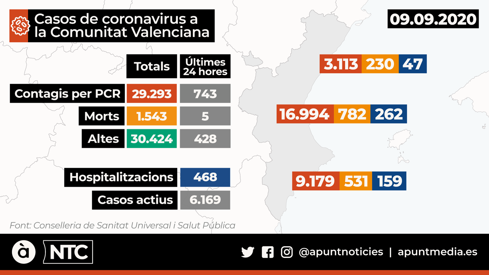 Continua l’escalada dels nous casos de coronavirus a la Comunitat Valenciana. La Conselleria de Sanitat Universal ha notificat aquest dimecres 743 casos en les últimes 24 hores, 70 més que dimarts. Així, la xifra total de persones que s’han contagiat des de l’inici de la pandèmia ascendeix a 29.293. Per províncies, 3.113 a Castelló, 9.179 a Alacant i 16.994 a València.