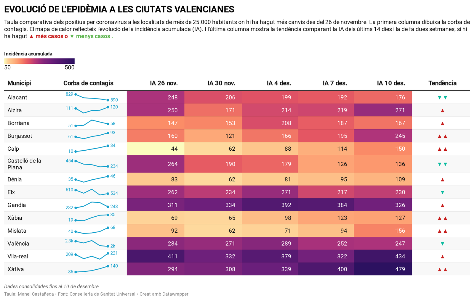 Desembre ha portat un nou canvi de tendència en l’evolució dels contagis per coronavirus a la Comunitat Valenciana. Si des del pic del 14 de novembre la corba epidemiològica anava baixant amb algunes fluctuacions, a partir de l’1 de desembre ha tornat a escalar de manera clara fins a situar-se en nivells que no es veien des de fa 3 setmanes.