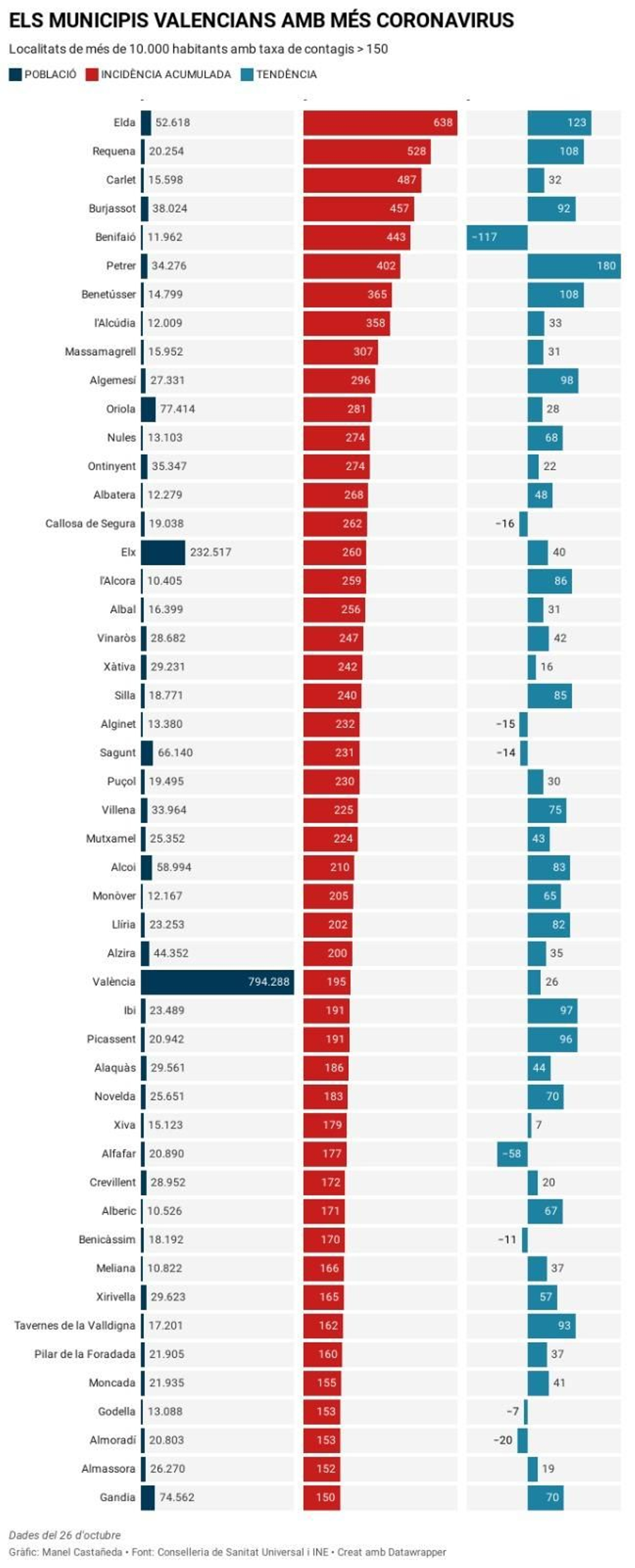 Pràcticament tots els municipis de més de 10.000 habitants experimenten una tendència ascendent de nous contagis, excepte Onda. En aquesta localitat de la Plana Baixa sí que estan tenint resultat les restriccions imposades per la Generalitat per a reduir el contacte social, ja que s'ha aconseguit reduir la incidència a quasi a la meitat. En l'altre costat destaca Requena, on la incidència acumulada ha passat de 419 contagis per cada 100.000 veïns a 528 quatre dies després, després d'haver sumat 40 positius.