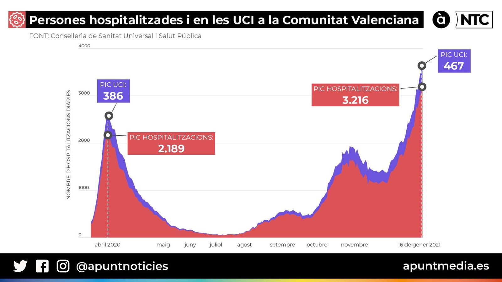 Quant a les hospitalitzacions, aquest dissabte s'han tornat a registrar xifres rècord tant en planta com en les unitats de cures intensives, amb 3.216 pacients Covid, 467 en situació crítica. La pressió assistencial del sistema sanitari valencià és la més elevada de tota la pandèmia, amb el percentatge d'ocupació hospitalària més alt de tot l'estat espanyol.