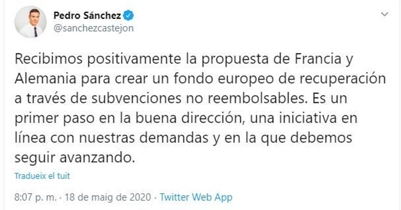 El govern espanyol ha rebut “positivament” la proposta d’Alemanya i França d’habilitar un fons de 500.000 milions d'euros per a recuperar l’economia europea a través de subvencions reemborsables als països i els sectors més colpejats per la pandèmia del coronavirus.
