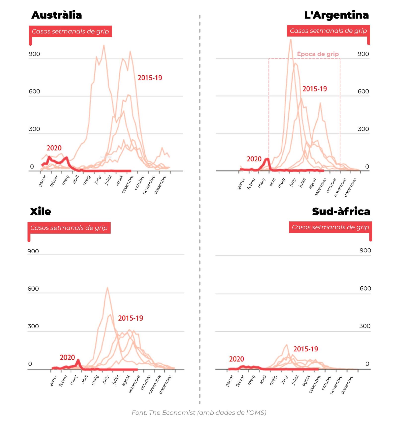 Confinaments, mascaretes i distància social provoquen una caiguda en picat de la grip en països com Austràlia, l'Argentina, Xile o Sud-àfrica.