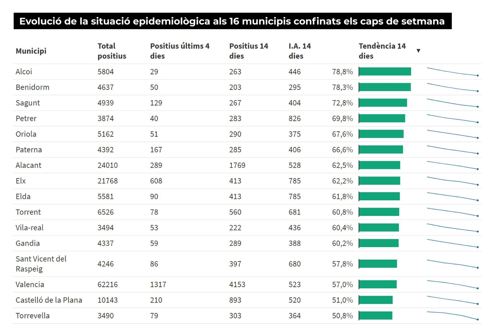 La tendència descendent en els indicadors de la pandèmia a la Comunitat Valenciana es consolida segons avança el mes de febrer. Les dures restriccions decretades per la Generalitat a causa de la Covid-19 per a reduir al mínim el contacte social en tot el territori i limitar la mobilitat durant els caps de setmana i festius en els quinze grans nuclis poblacionals (setze si es considera Petrer, que forma conurbació amb Elda), ja comencen a donar fruits de manera evident, impulsats també per la campanya de vacunació massiva. Després d'un gener negre amb registres històrics de contagis, la incidència acumulada del virus entre la població de les ciutats tancades perimetralment s'ha reduït més de la meitat en les dues primeres setmanes de febrer, segons constaten les dades municipals publicades aquest dimarts per la Conselleria de Sanitat Universal.