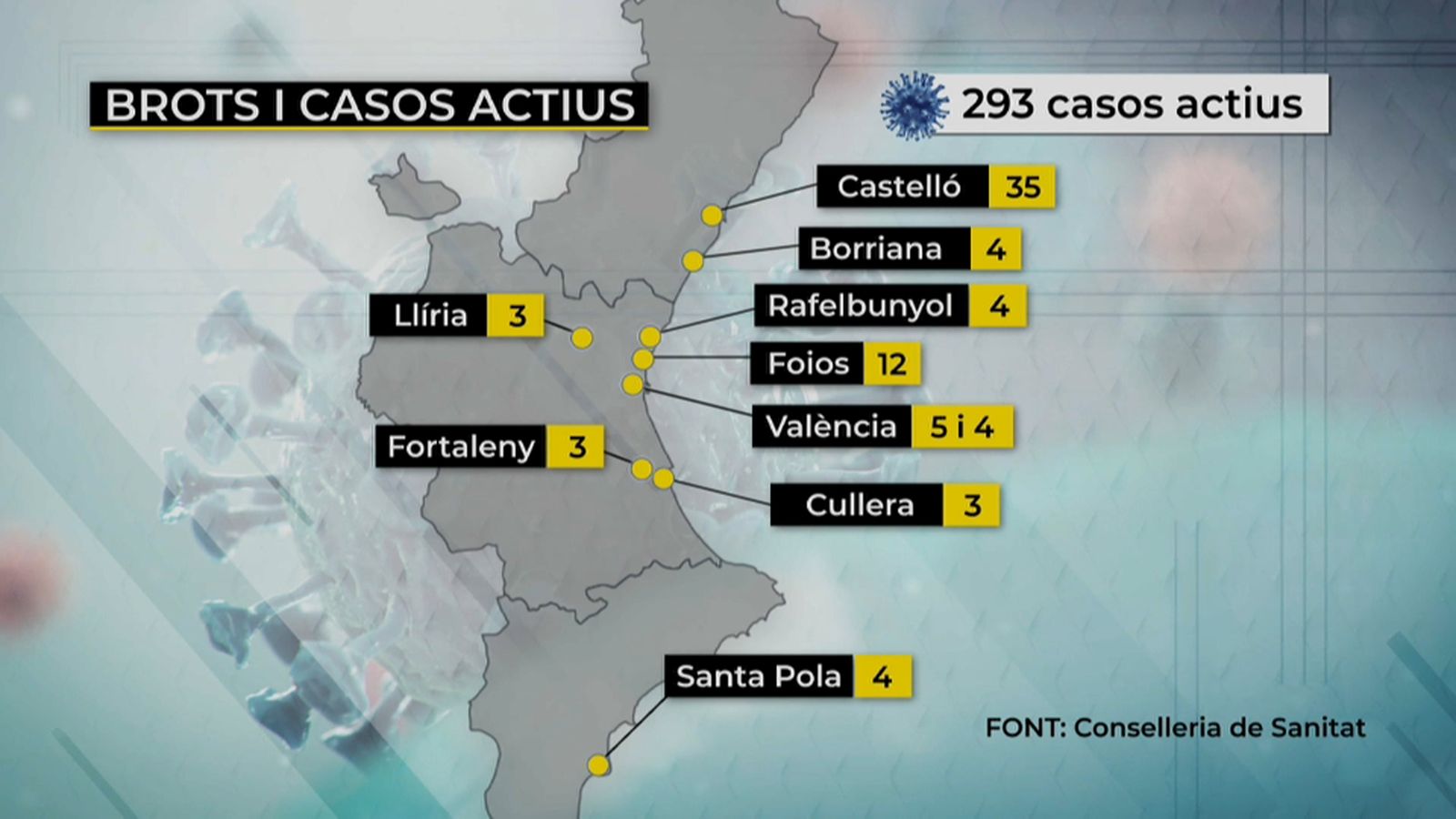 La Comunitat Valenciana té deu brots actius a hores d'ara, set dels quals afecten nuclis familiars. Es localitzen a Fortaleny, Foios, València (dos), Cullera, Castelló, Rafelbunyol, Llíria, Santa Pola i Borriana. La setmana passada va declarar-se'n un a Burjassot, que la Conselleria de Sanitat va donar per tancat fa uns dies. Segons l'últim balanç, en tota la Comunitat Valenciana hi ha 293 casos actius, 37 detectats en l'última jornada. A més, aquest dimarts s'ha complit una setmana sense cap defunció.