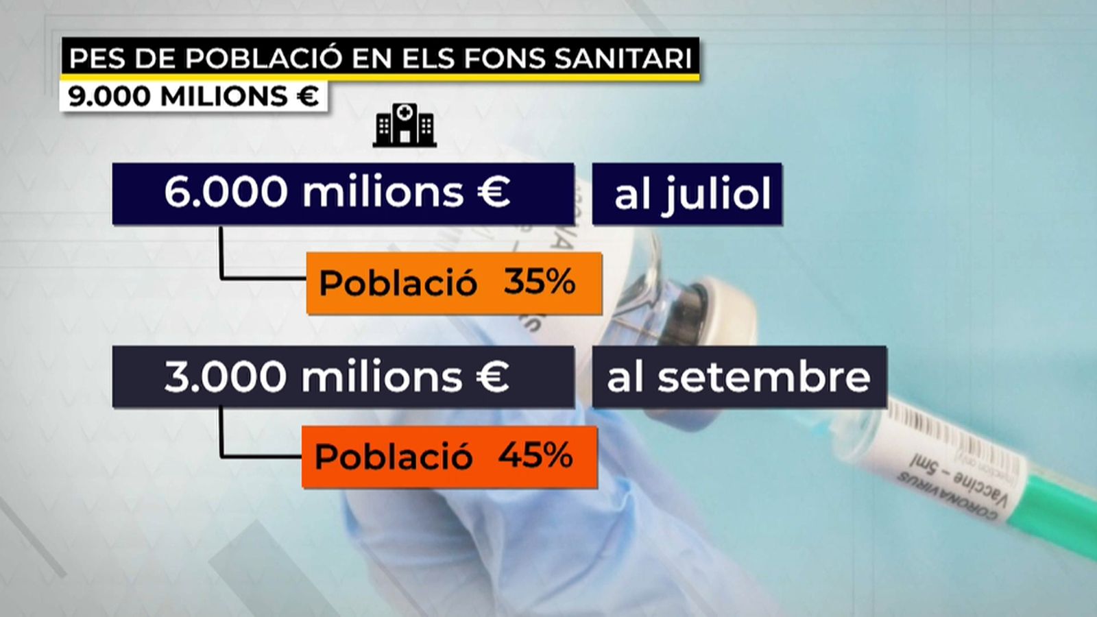Els 9.000 milions d'euros del fons sanitari es divideixen en dos trams. Al juliol, es pagaran 6.000 (el 35% correspondrà a la població protegida), mentre que al setembre s'abonaran 3.000 milions més. En aquest últim pagament, el criteri de població se situa en el 45%.