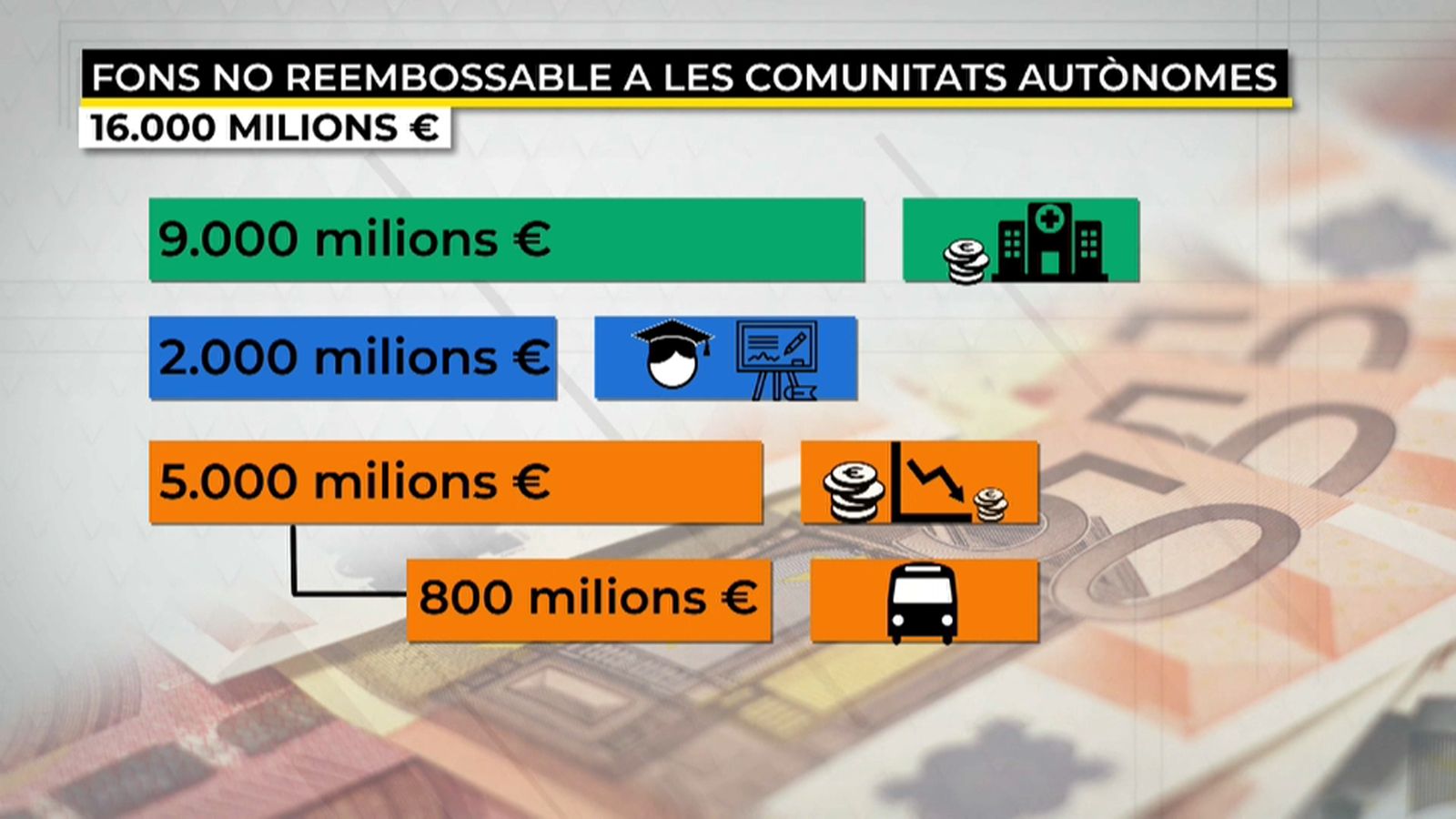 Dels 16.000 milions no reembossables que el govern espanyol preveu transferir a les autonomies, 9.000 es destinaran a compensar la despesa sanitària, 2.000 aniran a educació i els 5.000 restants pal·liaran la caiguda en la recaptació tributària. En aquesta última bossa es reserven 800 milions per al transport públic.