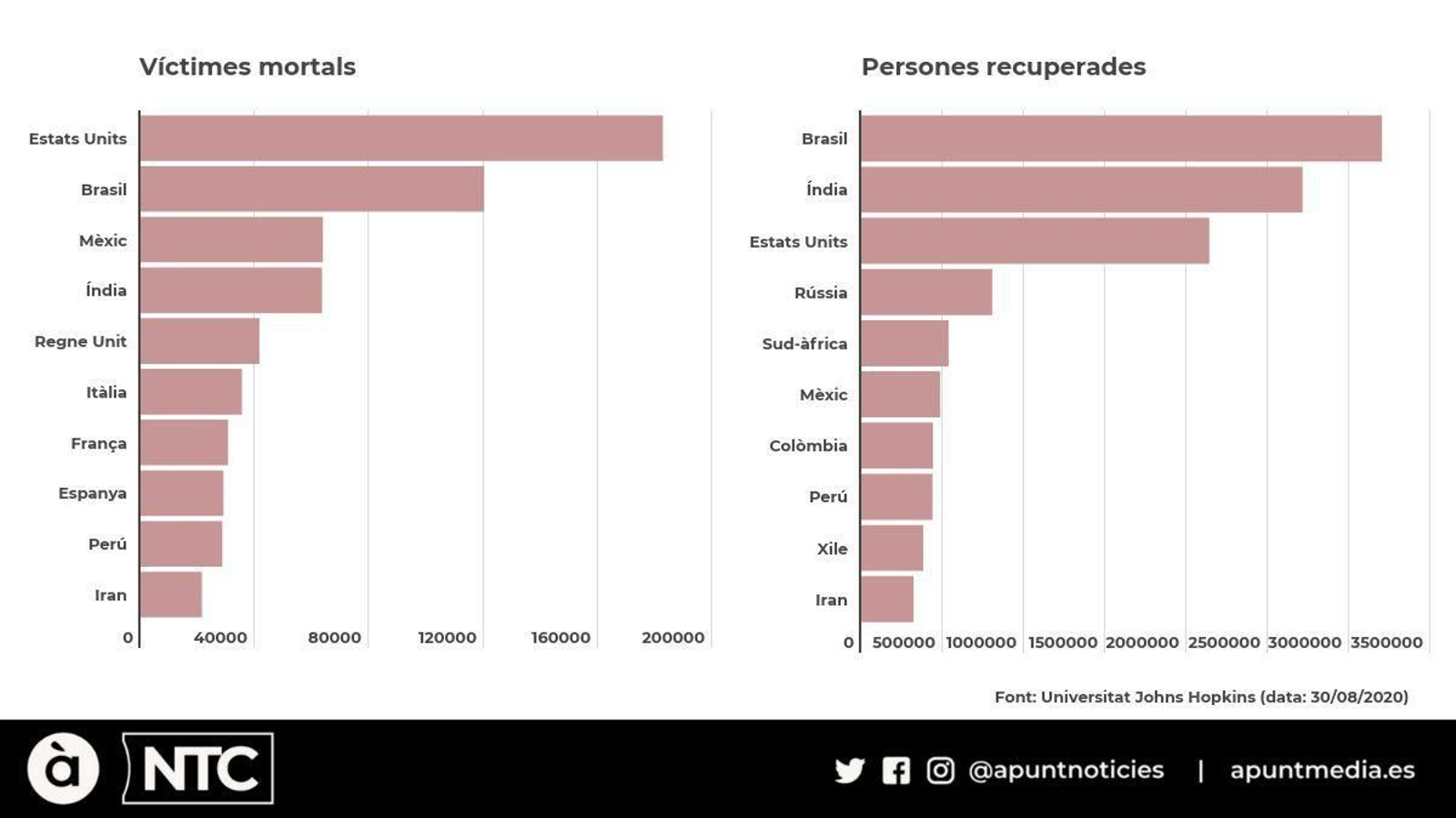 Quant al còmput global de morts, se n’han registrat més de 840.000. El 22% han ocorregut als Estats Units, on el nombre de morts supera les 180.000. El Brasil és, de nou, el segon país amb més defuncions registrades, amb més de 120.000. Mèxic i l’Índia, els següents països de la llista, ja sumen més de 63.000 morts.