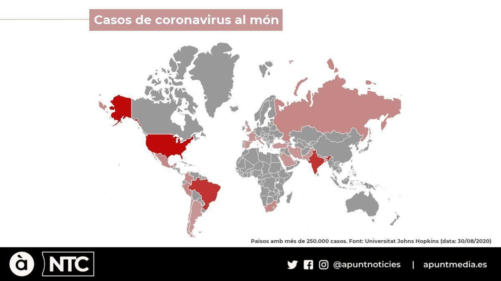 El segon país amb més casos de Covid-19 és el Brasil, amb vora 4 milions de persones contagiades. Per darrere es troba l’Índia, que ja suma més de 3,5 milions de positius i Rússia, que s’apropa al milió de contagis. Espanya és el nové país més afectat per la pandèmia al món i el segon a Europa amb quasi 440.000 casos.