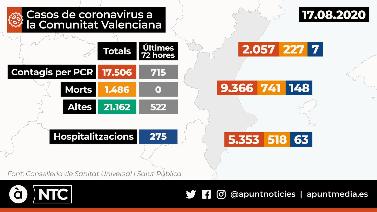 Els nous casos de coronavirus a la Comunitat Valenciana es disparen. Durant els últims tres dies s’han notificat 715 contagis, la xifra més alta de positius des que finalitzara l’estat d’alarma i 200 més dels que es registraven fa dues setmanes, el primer dilluns d’agost. Si els nous contagis es comparen amb els del mes passat en suposen 667 més, ja que el 17 de juliol es van diagnosticar només 48 noves infeccions. D’aquesta manera, el total de persones que s’han contagiat de coronavirus des de l’inici de la pandèmia arriba ja a 17.506.