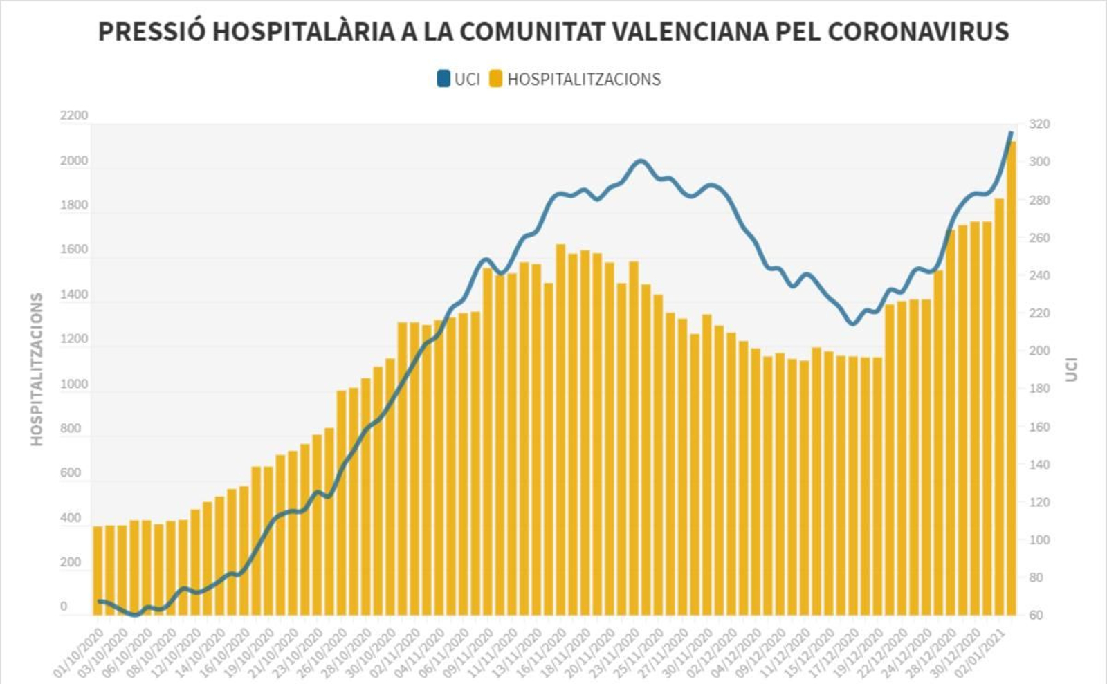 L’any comença amb els hospitals valencians que guaiten unes perspectives ben preocupants com a conseqüència del coronavirus. La pressió a què la malaltia està sotmetent el sistema sanitari només s’havia vist anteriorment en els pitjors moments de l’abril, quan els centres hospitalaris van viure moments de gran estrés, fins al punt que el govern valencià va decidir instal·lar d’urgència tres hospitals de campanya que finalment no van rebre malalts.