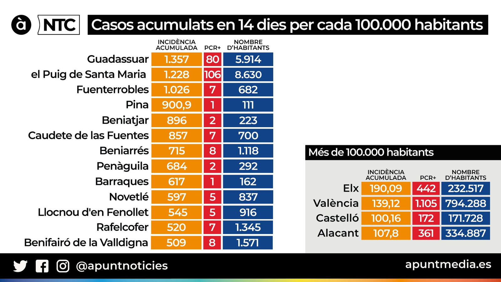 El primer de la llista es Guaduassar, amb 80 positius i 1.357 casos per cada 100.000 habitants en els últims 14 dies, sobre una població de 5.914 veïns. El segueixen El Puig de Santamaria que amb 106 contagis, té una incidència de 1.228 casos. El tercer és Fuenterrobles, amb 7 positius i 1.026 casos per cada 100.000 habitants en els últims 14 dies, sobre una població de 682 veïns. El segueixen Pina que amb només 1 positiu, té una incidència de 900 casos, ja que és un poble molt menut amb només 111 habitants.