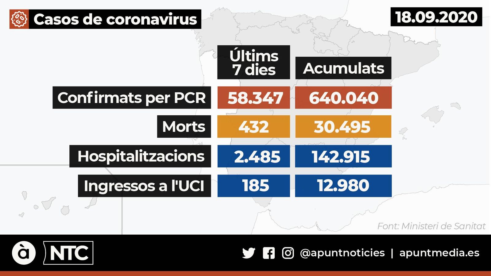 El total de contagis a Espanya se situa en 640.004 persones. De les xifres de morts, amb les d’aquest divendres s’han produït 432 defuncions des de dilluns.