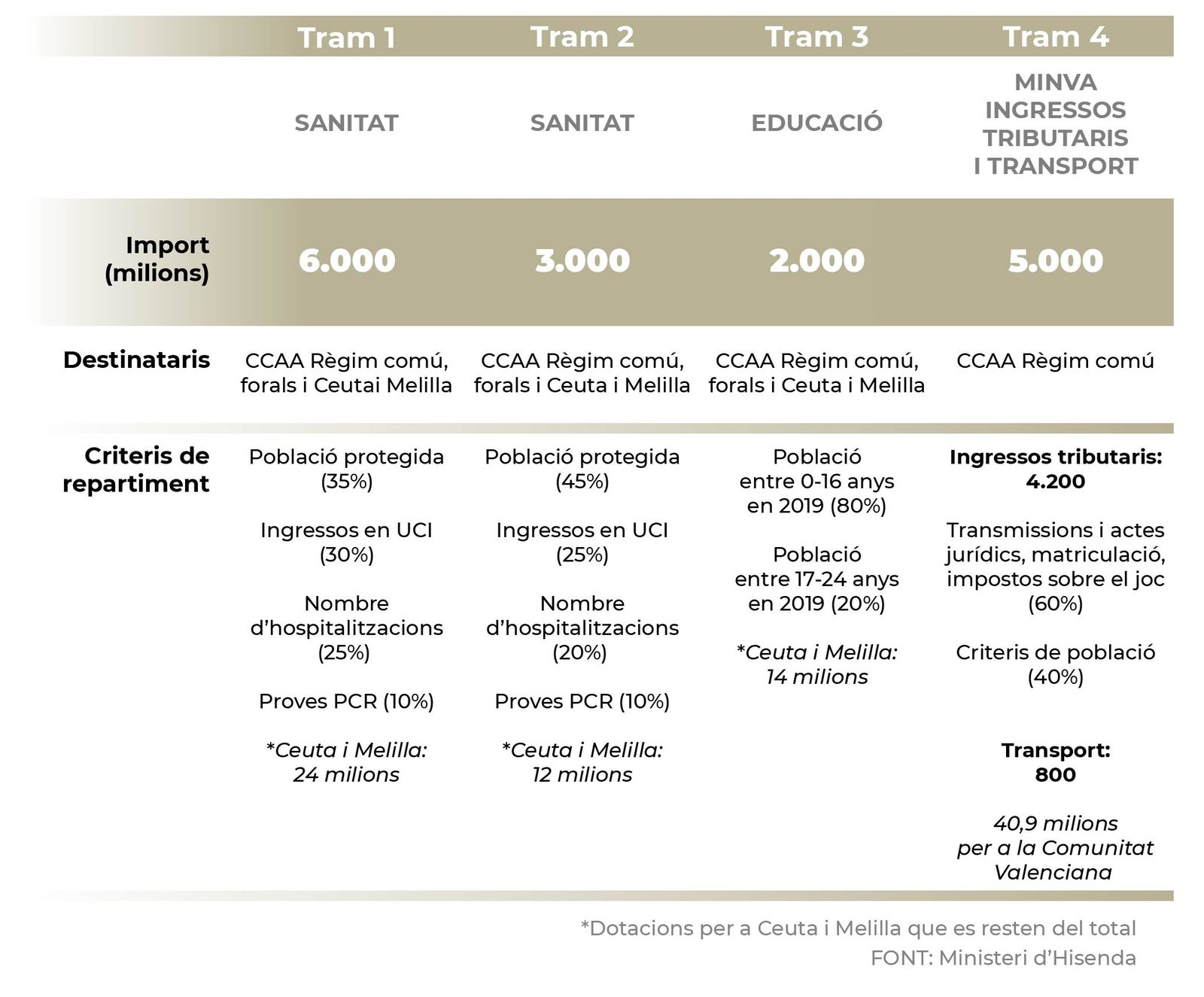 El primer lliurament al conjunt de les comunitats, corresponents al primer tram, serà de 6.000 milions per a sanitat i començarà a repartir-se aquest pròxim mes de juliol, i els altres 3.000 milions (segon tram), al novembre. El 35% d’aquests primers 6.000 milions del primer tram, uns 2.100, es distribuiran atenent criteris de població protegida; el 30% en funció dels ingressos en UCI, el 25% pel nombre d’hospitalitzacions i el 10% restant segons el nombre de proves PCR realitzades per cadascuna de les comunitats autònomes.