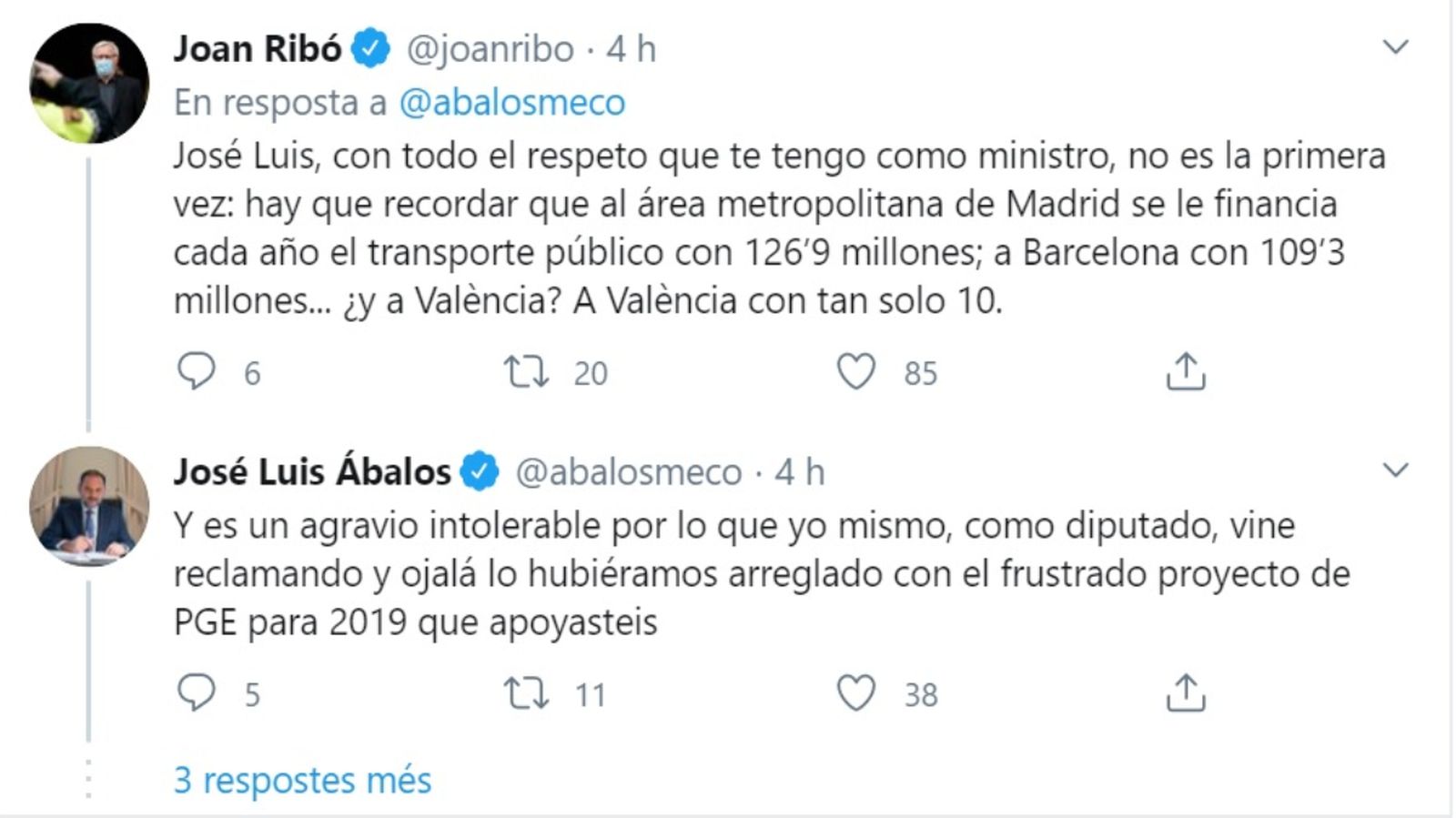 El ministre de Transports, José Luis Ábalos, i l’alcalde de València, Joan Ribó, han mantingut aquest dimecres un enfrontament dialèctic a través de Twitter sobre el finançament del transport metropolità.