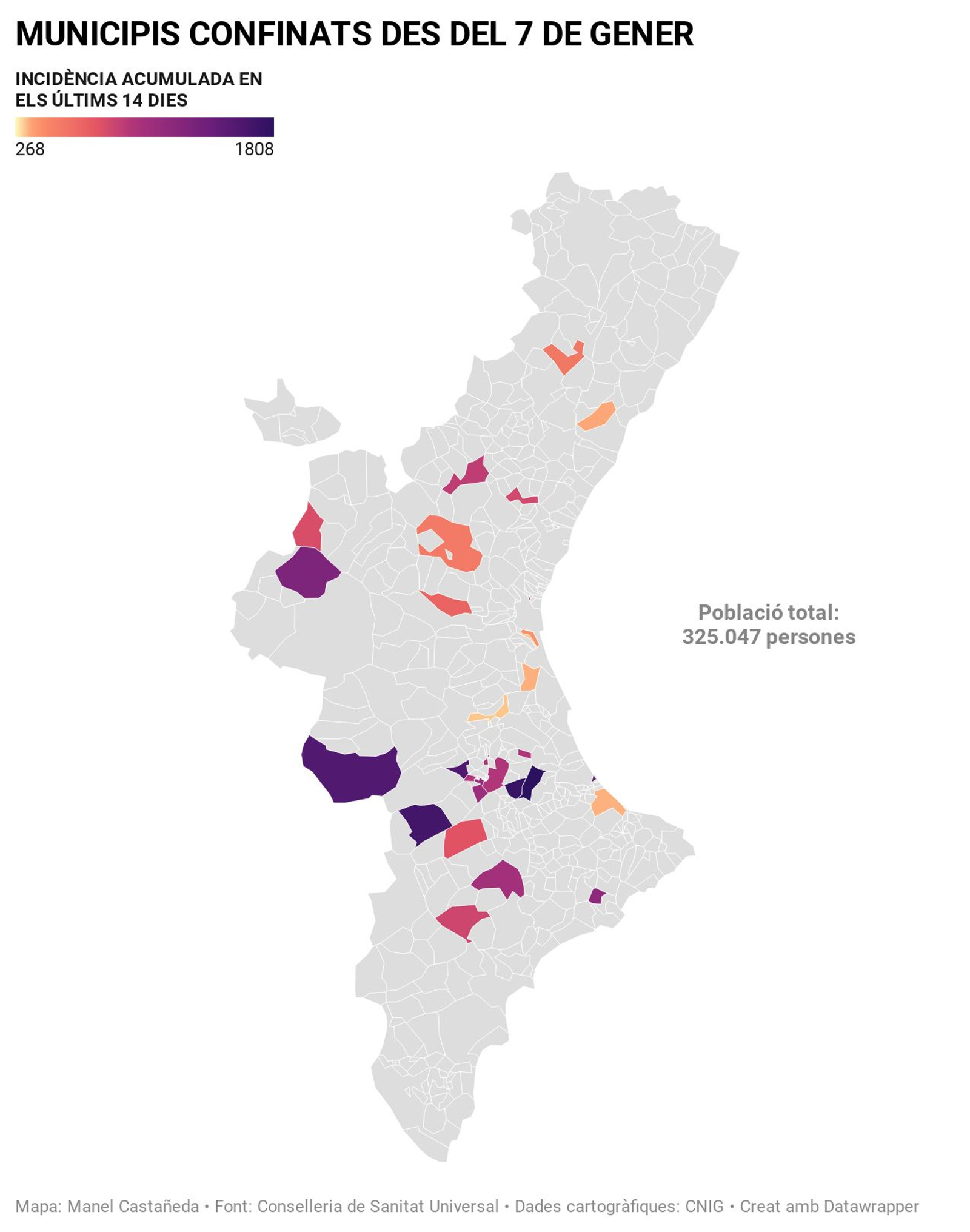 La consellera de Sanitat Universal, Ana Barceló, ha detallat què implica el confinament de 26 municipis amb més incidència, que entrarà en vigor el 7 de gener i fins al 31 d'aquest mes. Així mateix s'ha afegit el confinament de Benetússer, Alfafar i Llocnou de la Corona, municipis que, encara que no presenten tan alta incidència, estan molt pròxims a Sedaví i Massanassa. Les restriccions afecten 325.047 persones, un 6,5% de la població de la Comunitat Valenciana, segons dades de l'Institut Nacional d'Estadística.