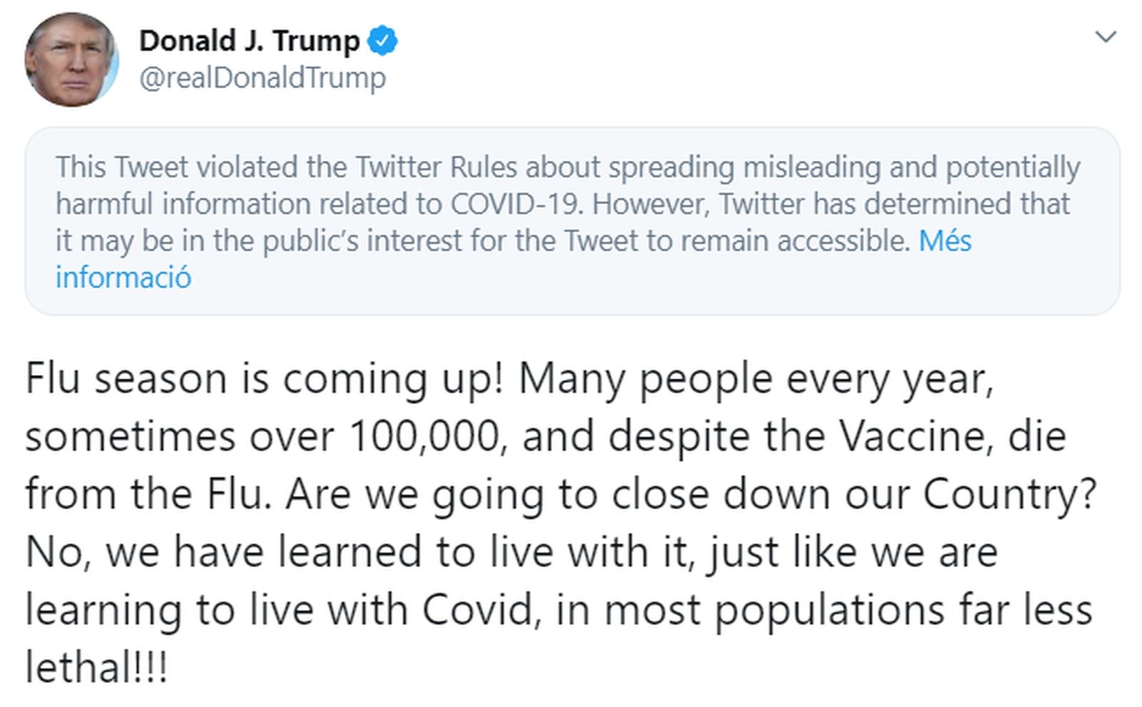 El missatge que ha compartit Trump, que va anunciar que estava contagiat de Covid-19 el passat dijous, era el següent: "La temporada de la grip s'acosta! Cada any, molta gent, en ocasions més de 100.000, i malgrat la vacuna, mor de la grip. Tancarem el nostre país? No, hem aprés a viure amb ella, just com estem aprenent a viure amb la Covid, en la majoria de poblacions molt menys letal".