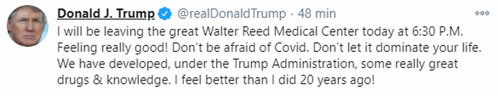"Eixiré del gran Centre Mèdic Walter Reed hui a les 18:00 h (22:30 h UTC). Em sent realment bé!", ha expressat Trump en un breu missatge que ha publicat en el seu compte de Twitter. "No li tingueu por a la Covid. No deixeu que domine la vostra vida", ha agregat el mandatari nord-americà, a qui dijous passat li detectaren el coronavirus.