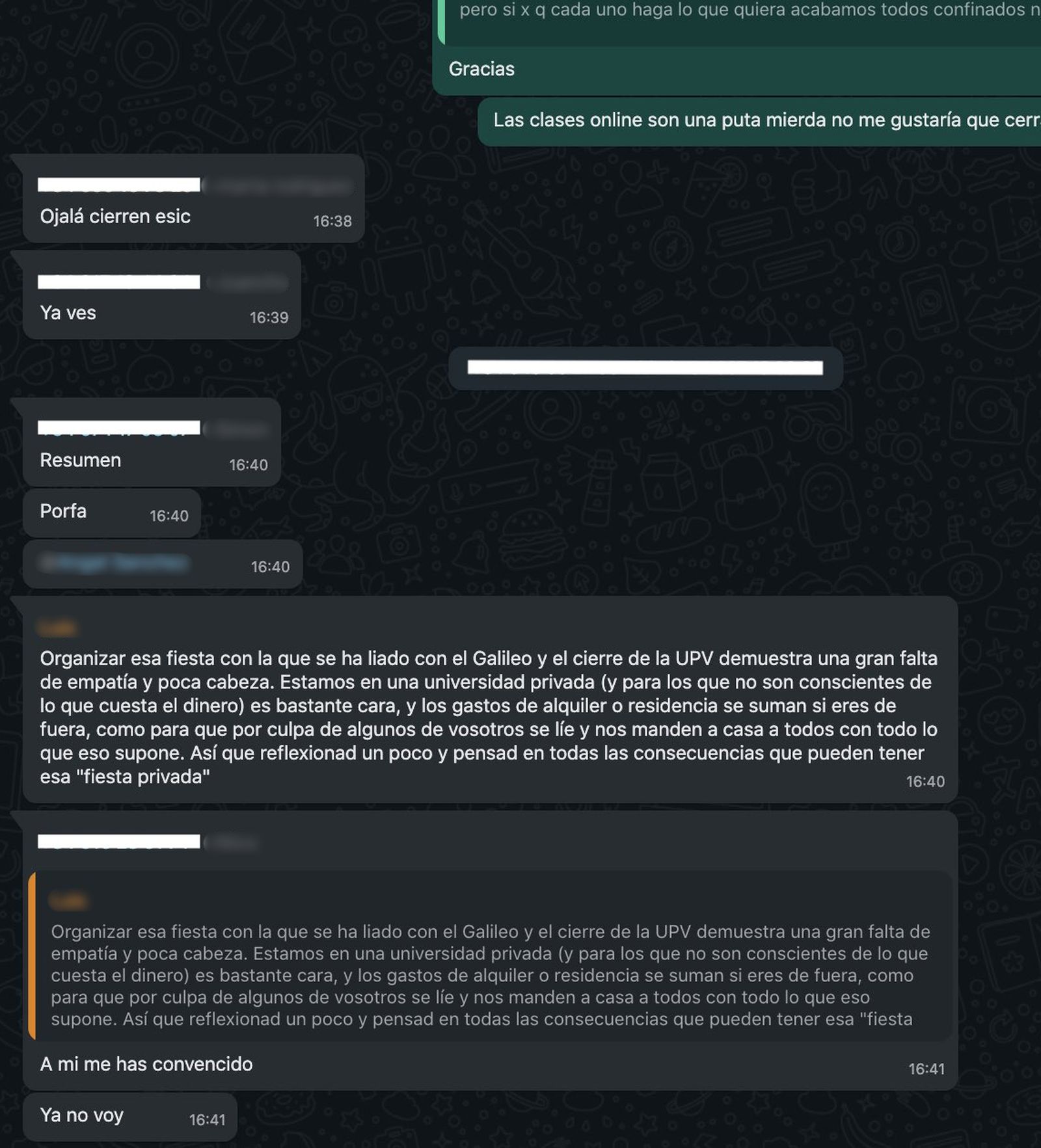 En les imatges que ha adjuntat es veu una conversa en una xarxa de missatgeria instantània entre un grup d'estudiants del centre en què es faciliten les dades de la festa i, fins i tot, el preu de les botelles. La convocatòria ha generat molta polèmica en les xarxes socials, amb gran quantitat de publicacions en rebuig per la situació sanitària actual. En el mateix xat hi ha hagut també reaccions contràries d'altres alumnes, que han acusat els promotors de la festa de tindre "falta d'empatia" i "poc cap".