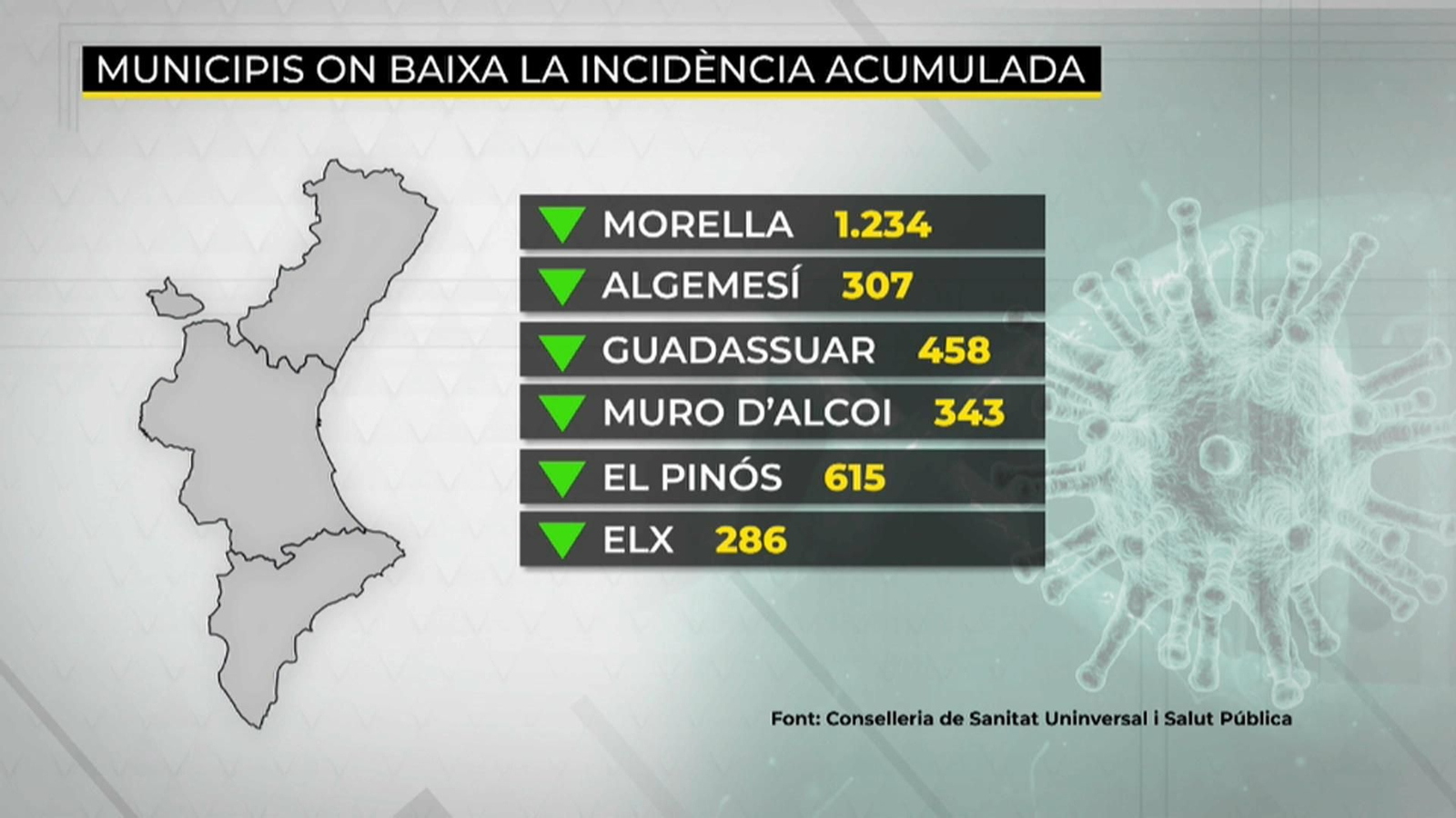 L'altra cara de la moneda en el mapa valencià del coronavirus la posen els municipis on les restriccions sanitàries sí que estan funcionant i estan doblegant la corba epidemiològica. Entre ells estan Morella, Muro d'Alcoi, Algemesí, Ibi, Elx o el Pinós.