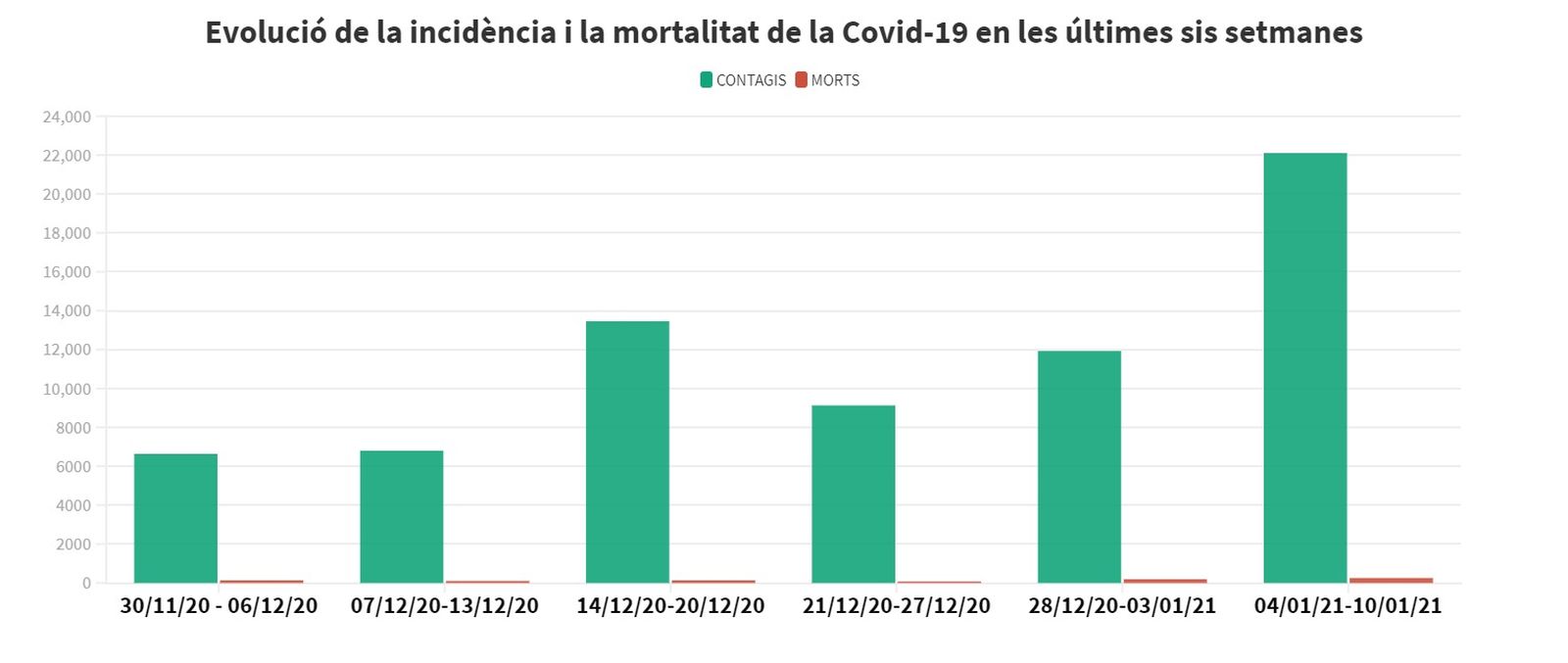 Entre el 4 i el 10 de gener s'han registrat 22.103 positius i 256 morts, unes xifres mai vistes en només set dies des que va començar la crisi sanitària. Els casos de l'última setmana completa multipliquen per més de tres els diagnosticats entre el dilluns 30 de novembre i el diumenge 6 de desembre (6.637), mentre que les víctimes mortals quasi dupliquen el registre setmanal de fa mes i mig.