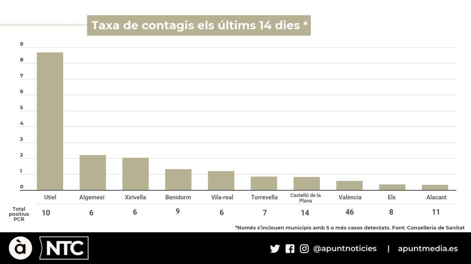 Els casos de les últimes dues setmanes a Utiel (Plana d'Utiel-Requena) creixen també de manera suau, en passar de 8 a 10. És el municipi amb la taxa més alta de contagi a tota la Comunitat Valenciana, 8,67. El segueix Algemesí en segon lloc, però a distància, ja que en el seu cas baixa a 2,2. En aquesta localitat de la Ribera Alta disminueixen lleugerament els casos diagnosticats en els últims catorze dies, en passar dels 7 que tenia el 31 de maig a 6 el 3 de juny.
