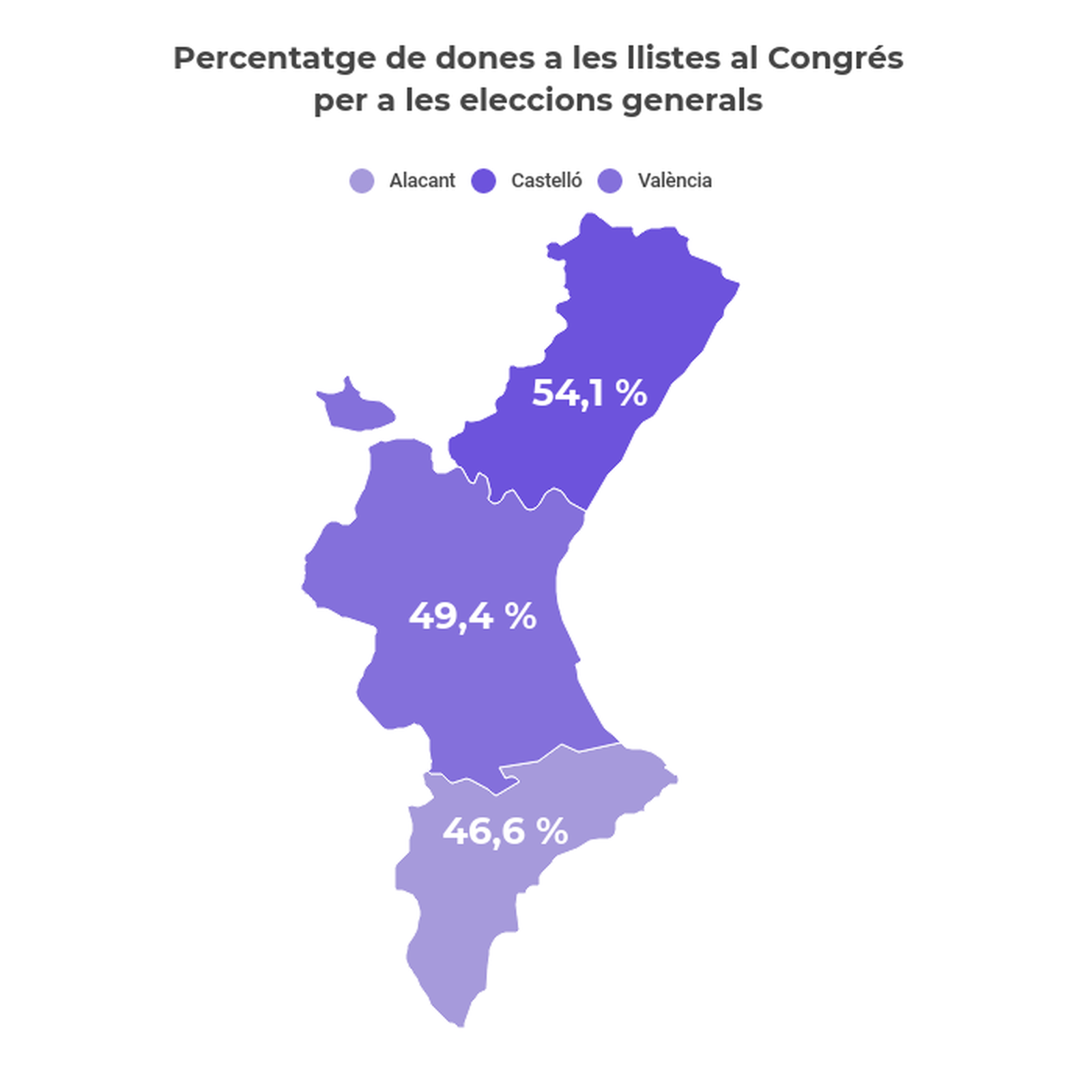 Les dones només són majoria en les llistes de 12 de les 52 circumscripcions espanyoles per al Congrés. Castelló (54,1%) és la quarta circumscripció amb més percentatge de dones i l’única de les valencianes, ja que a València representen un 49,4% i a Alacant, un 46,6%.